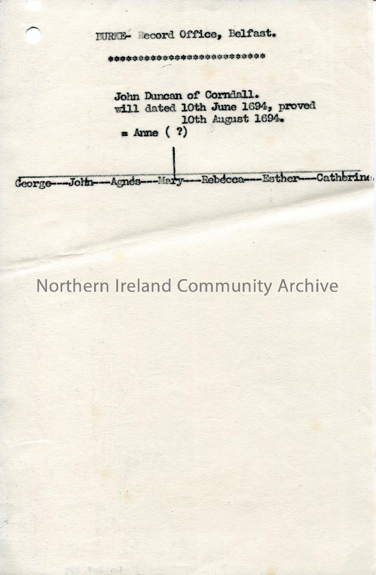 Copy of typed part of family tree of John Duncan of Corndall. Page headed 'BURKE - Record Office, Belfast'.