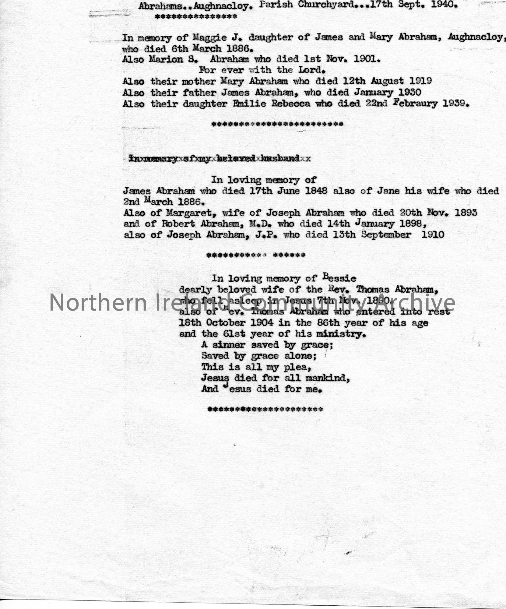 Copy of typed three inscriptions from gravestones from Aughnacloy Parish Churchyard re the Abraham family. Dated 17th September, 1940.
