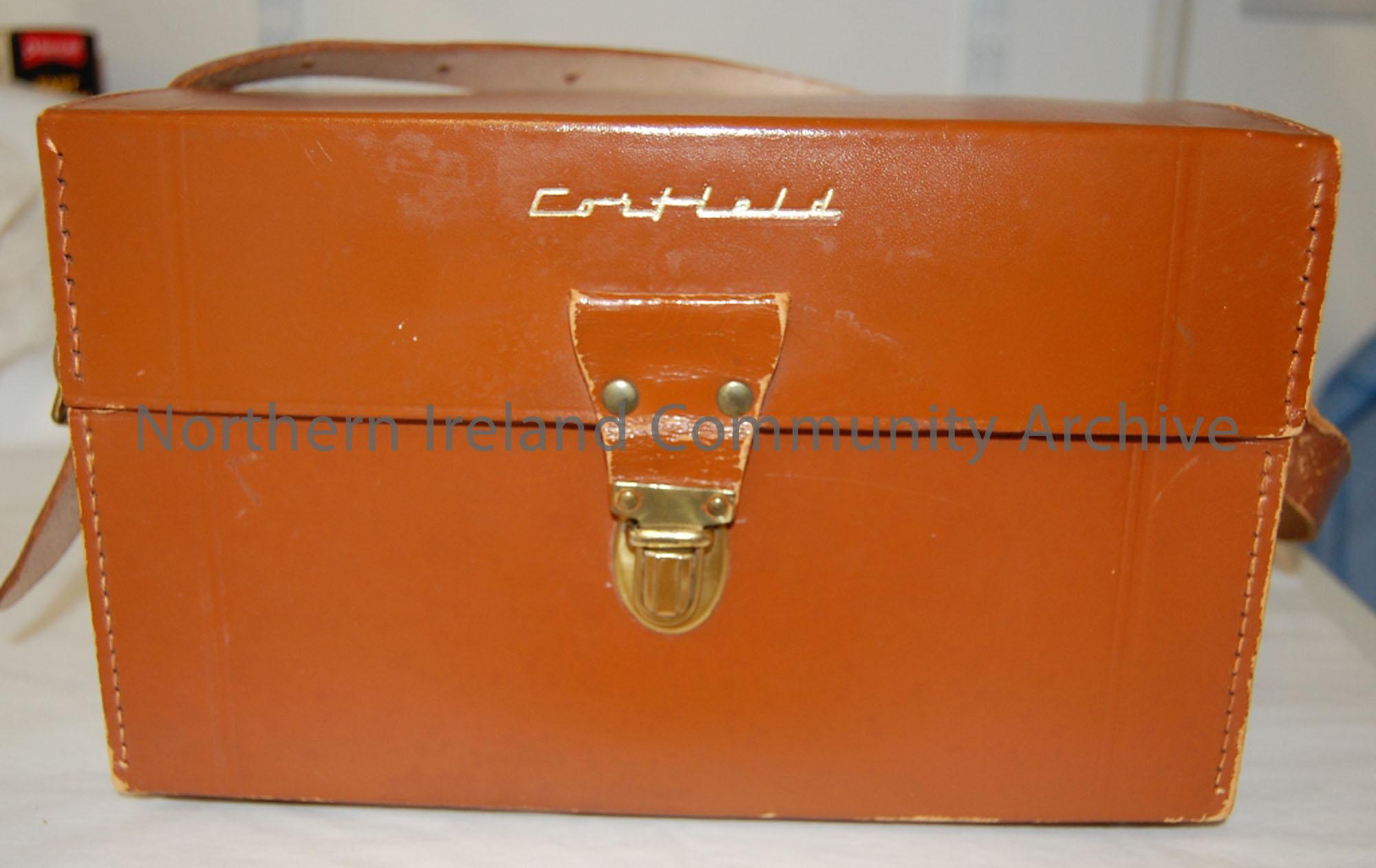 Corfield camera bag. Tan leather exterior, with 'Corfield' in gold lettering. Burgundy velvet interior