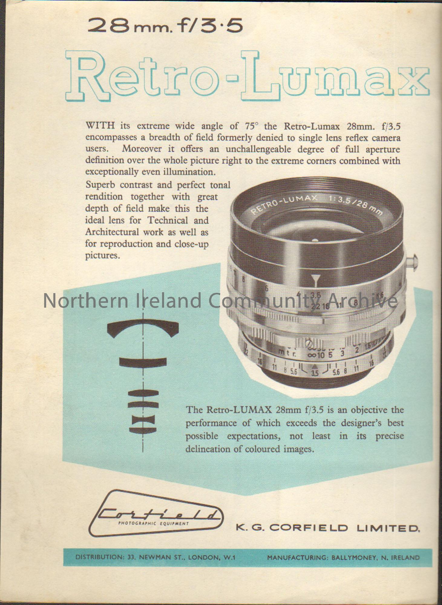 Corfield Photographic Equipment advertisement for the 28mm. f/3.5 Retro-Lumax lens with a picture of the lens on a light blue and white background.
