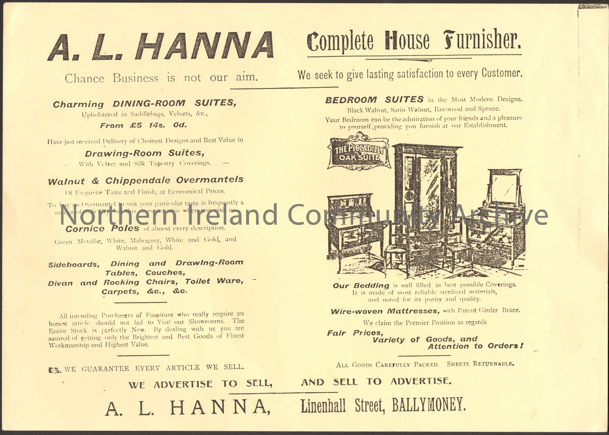 Cream card with black type. A. L. Hanna, Complete house Furnisher. Picture of the Piccadilly Oak Suite.