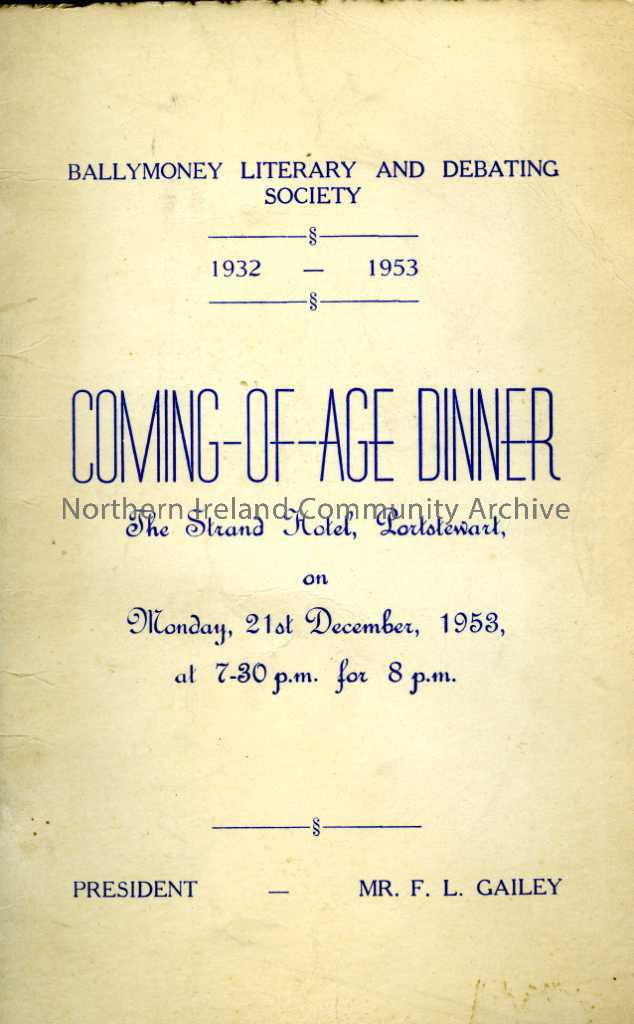 Cream coloured card menu/leaflet for Ballymoney Literary and Debating Society, 1932 - 1953, Coming of Age Dinner, The Strand Hotel, Portstewart, on Monday 21st December, 1953, at 7.30 pm for 8pm, President Mr F.L. Gailey. Pages inside list the Presidents, Secrataries, Treasurers and Members of General Committee from 1932 - 1954, then the menu and toast list, then continues with the members of general committee, dramatic seretaries, dramatic treasurers and members of dramatic committee.