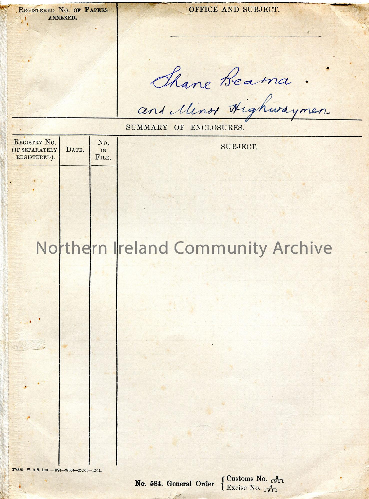 Cream coloured Customs and Excise folder. Front and back cover are held together with white bandage/gauze type material. 'Shane Bearna and Minor Highwaymen' handwritten on front cover.