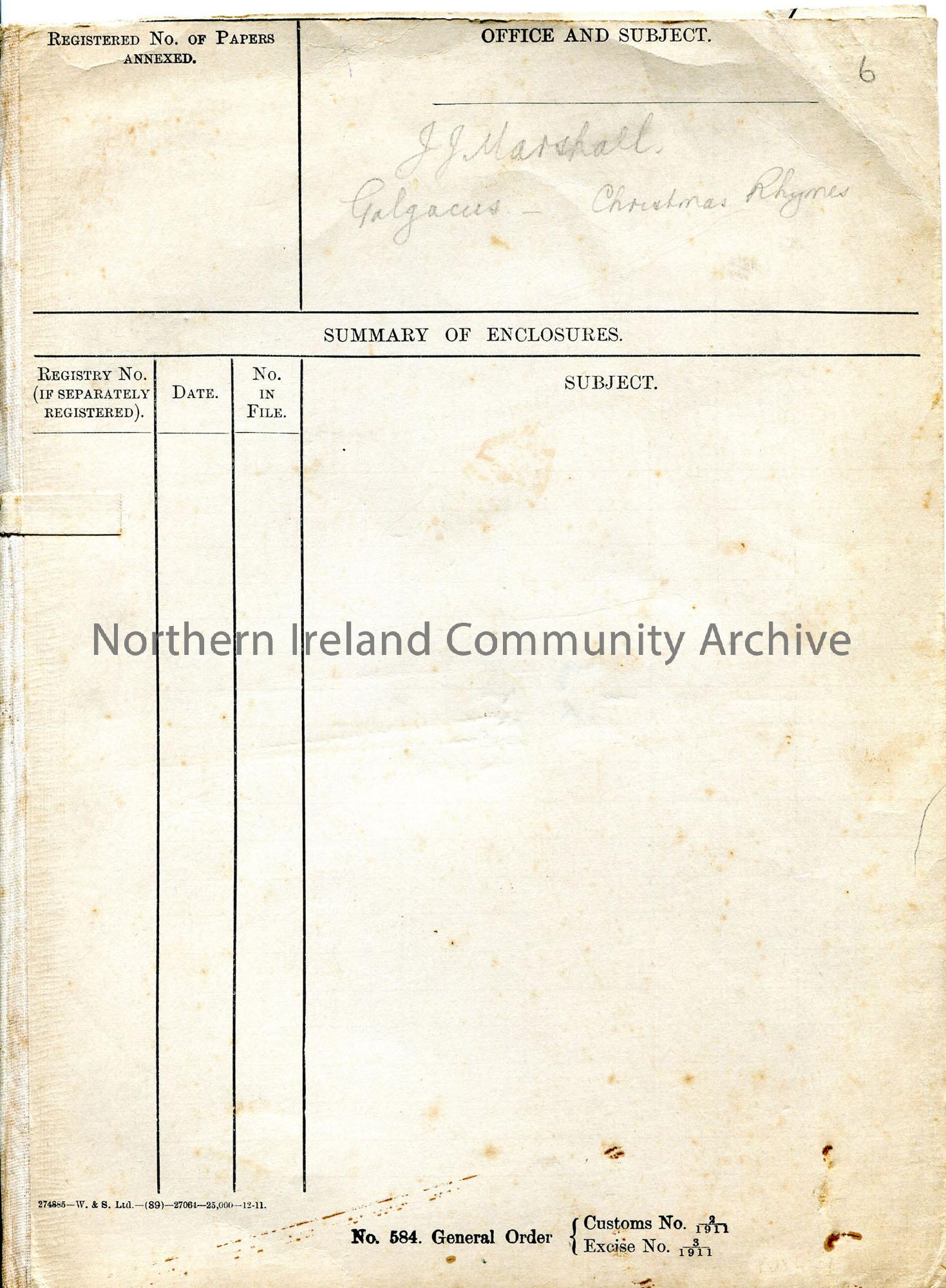 Cream Customs and Excise folder, labelled ‘J J Marshall – Galgacus – Christmas Rhymes’