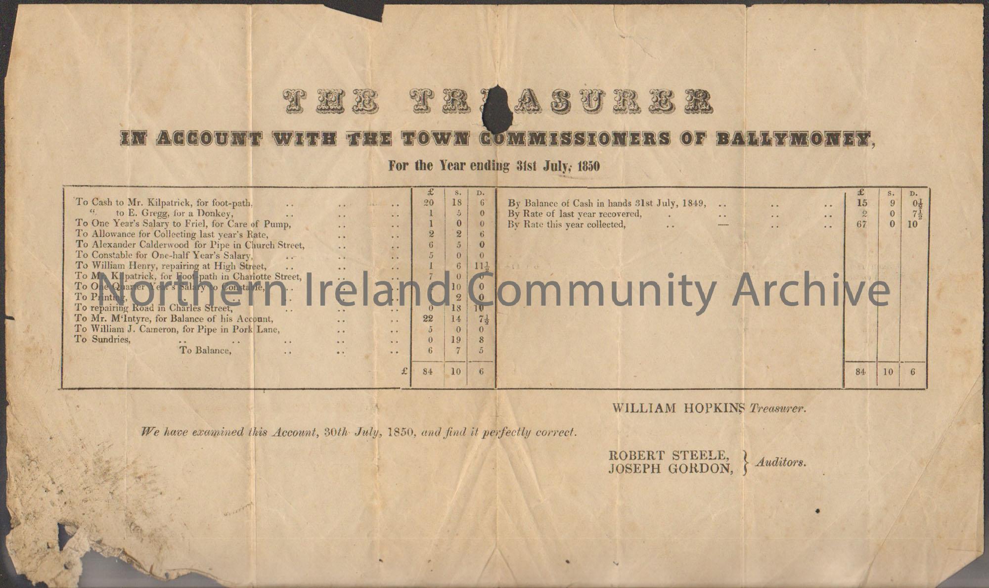 Cream document – The Treasurer in account with the Town Commissioners of Ballymoney