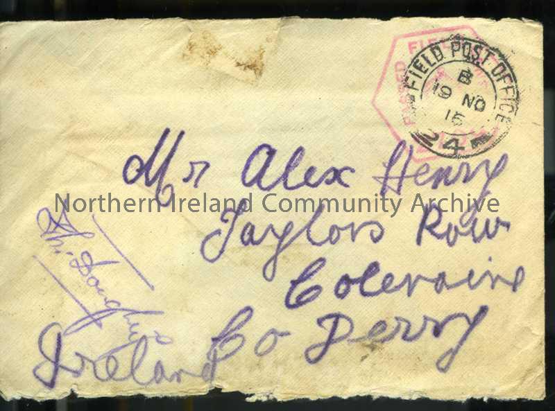 Cream envelope, addressed in purple pencil, with red censor stamp