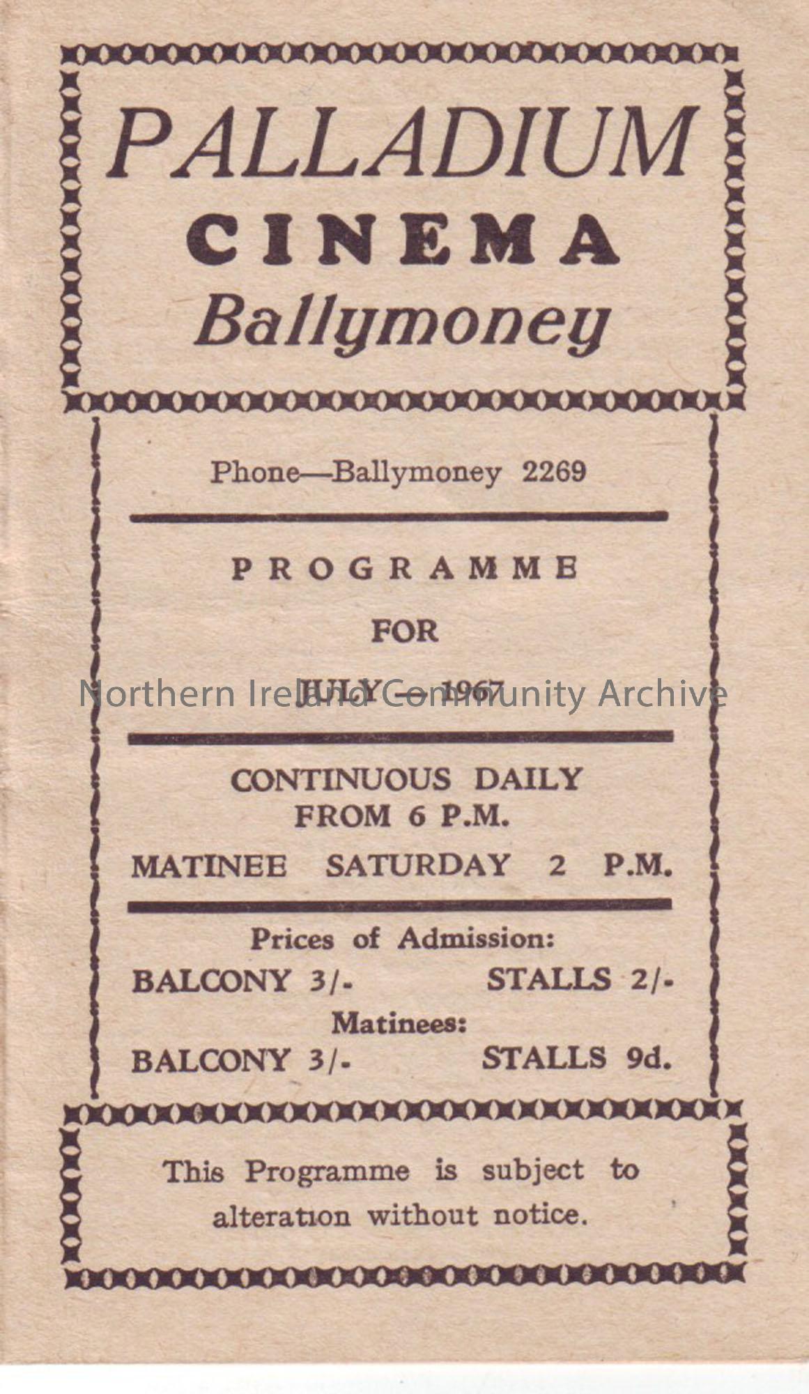 cream monthly programme for Ballymoney Palladium cinema- July 1967