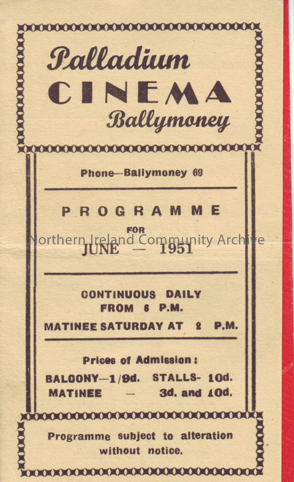 cream monthly programme for Ballymoney Palladium cinema- June 1951