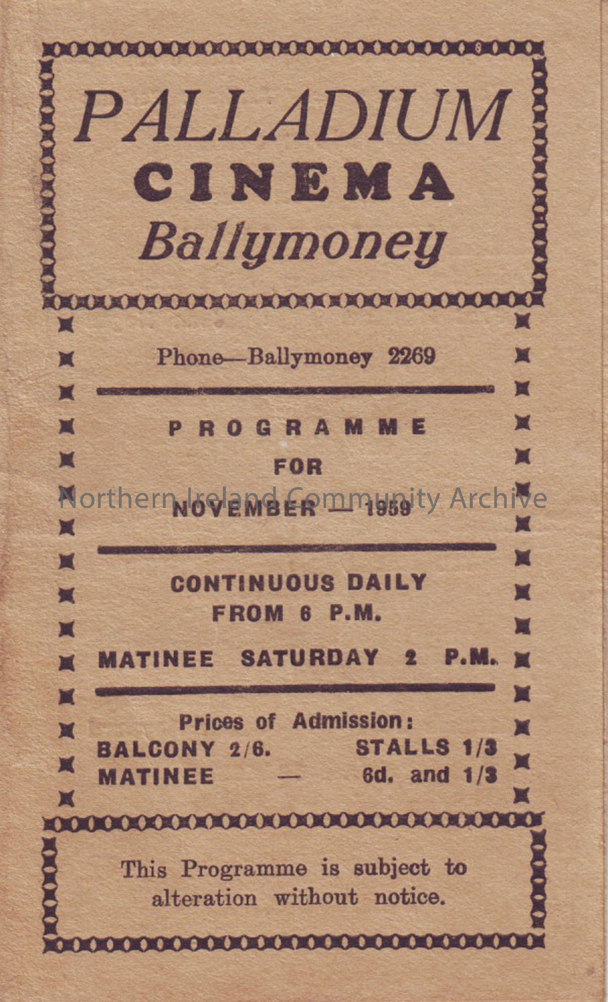 cream monthly programme for Ballymoney Palladium cinema- November 1959