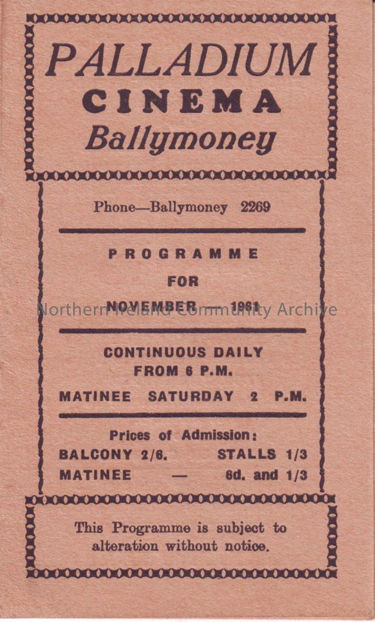 cream monthly programme for Ballymoney Palladium cinema- November 1961