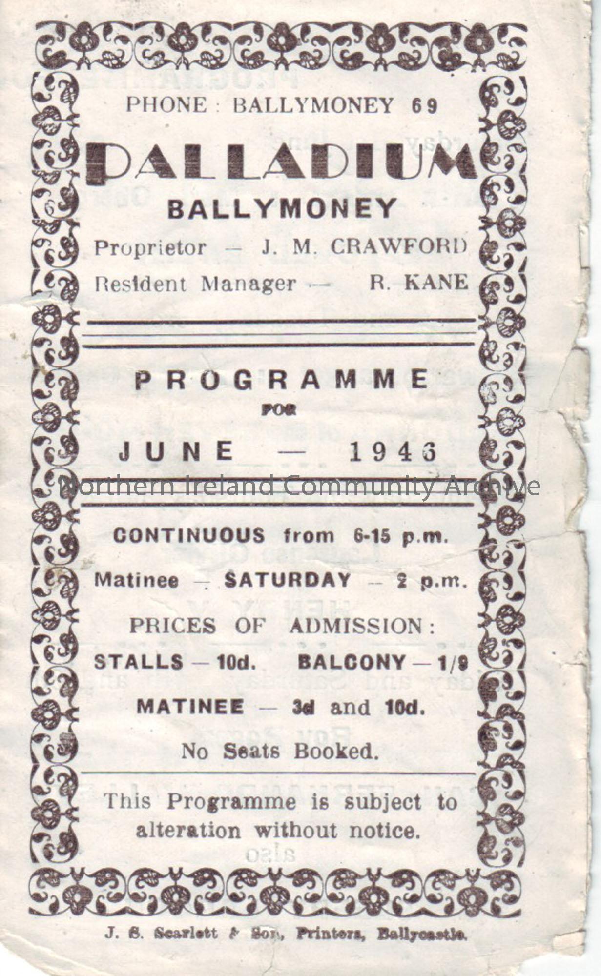 cream programme for Ballymoney Palladium cinema- June 1946
