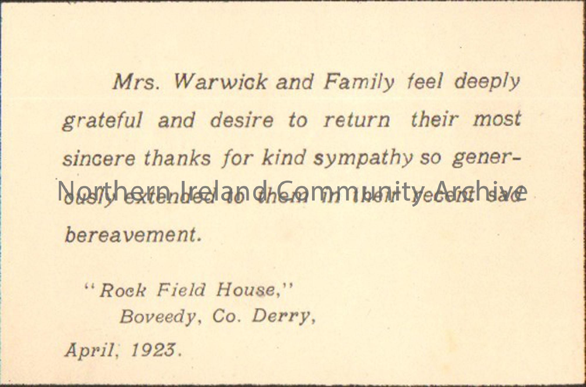 Cream square of card with black frame. Notice expressing Mrs Warwick's gratitude for kind sympathy following a death.