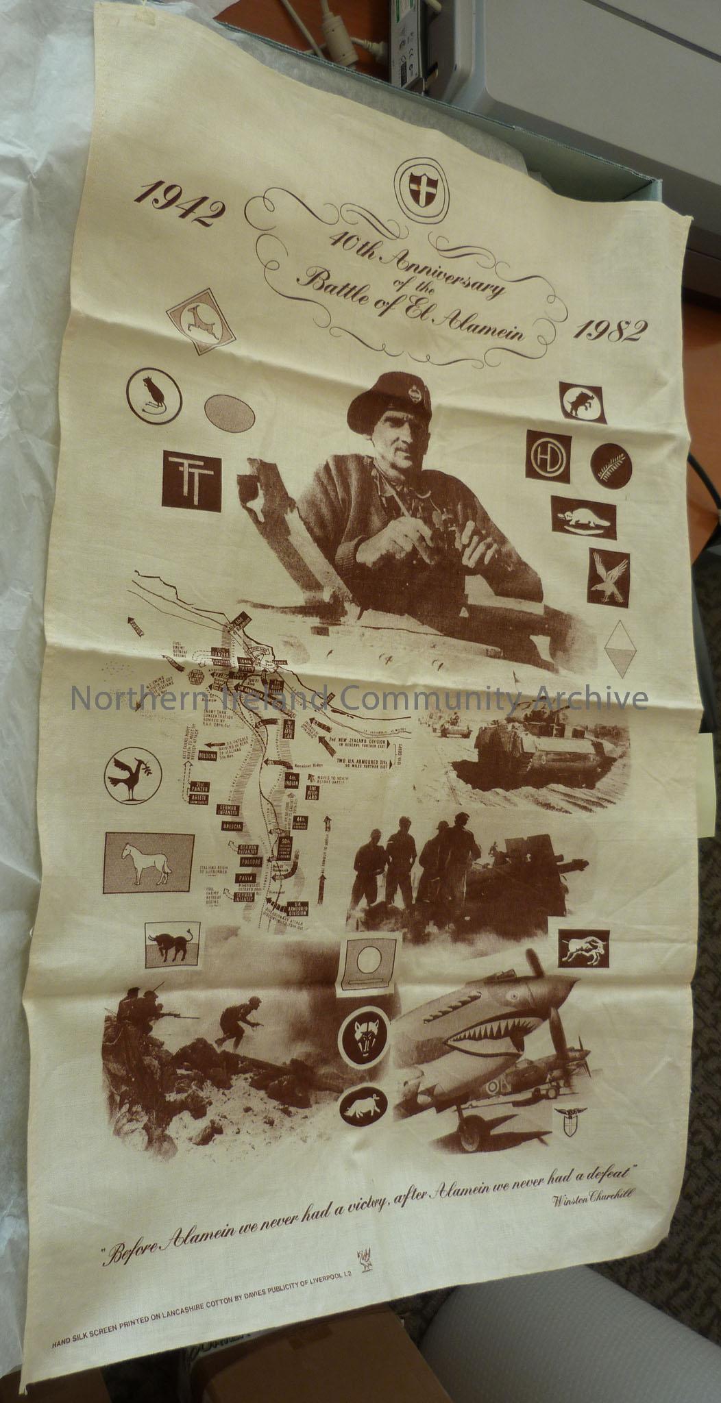 Cream tea towel with brown images of soldiers, military badges and a map commemorating the 40th anniversary of the Battle of El Alamein 1942-1982.