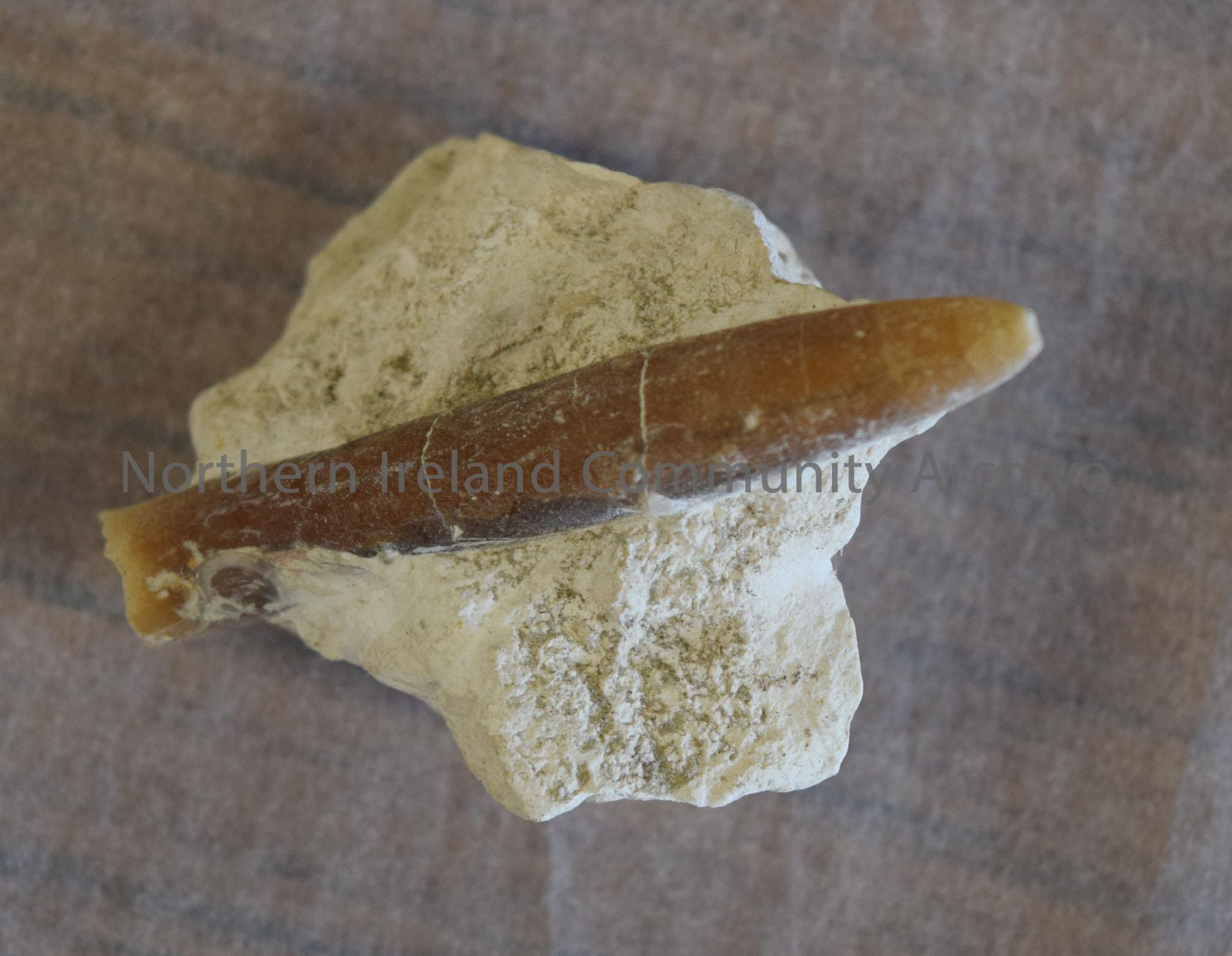 Cretaceous Belemnite. Brown finger shaped fossil embedded in a jagged chalky white rock.