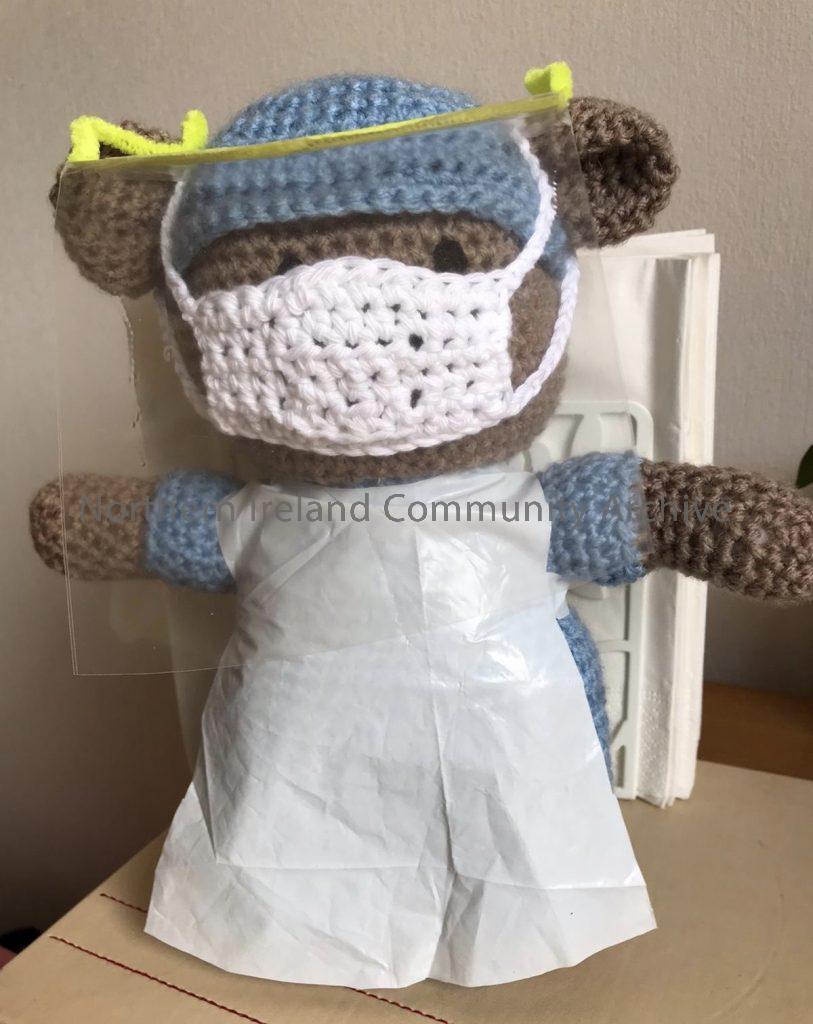 The bear in this image is presented to Museum Services by Georgie Dee, who crocheted it, to depict the current situation facing nurses who have to wear Personal protective equipment (PPE). In many hospitals this is not readily available to all staff, as can be depicted by the reused apron worn by the bear. The protective mask worn, also shows the need for nurses to ideally wear a mask, to offer them some protection during this Covid 19 pandemic. There is an army of volunteers who are busy making scrubs and masks, for nurses and care home staff.
