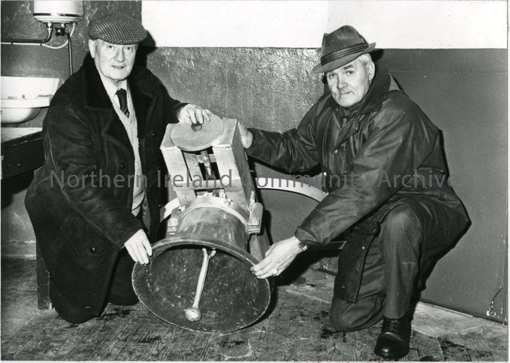 Curfew Bell, Coleraine, 1619, Sammy Walker and Willie Stewart examine the Bell at Market Yard.