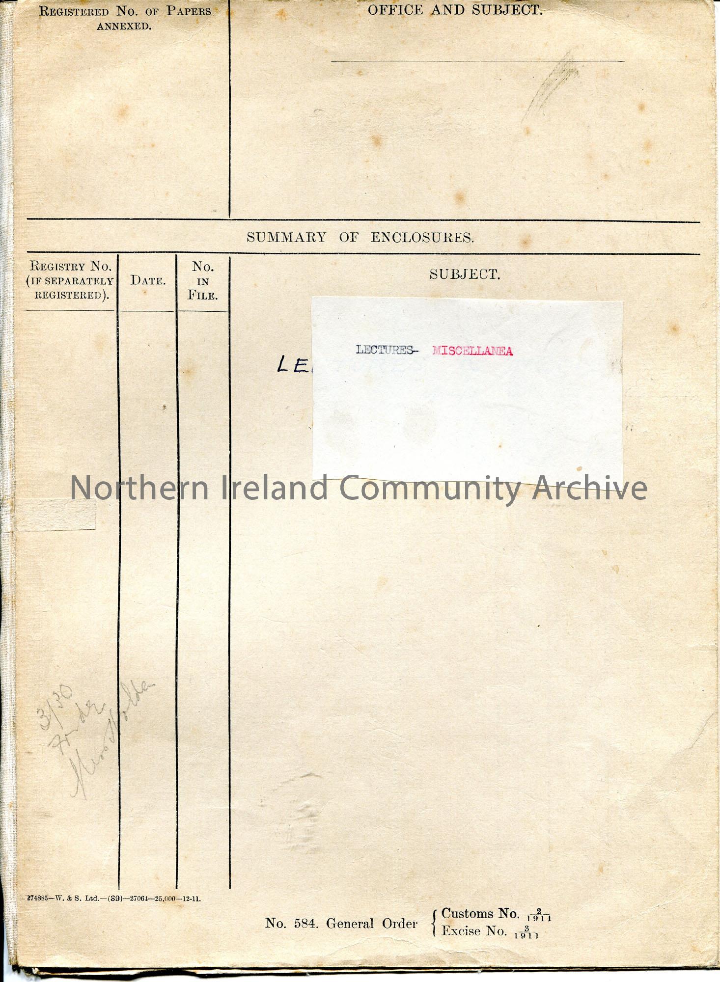 Customs and Excise folder consisting of two pieces of card for front and back cover and held together with a strip of white cotton? material. Labelled 'Lectures - Miscellanea'. '3/30 Friday Miss Holden[?]' handwritten in pencil bottom of front cover.