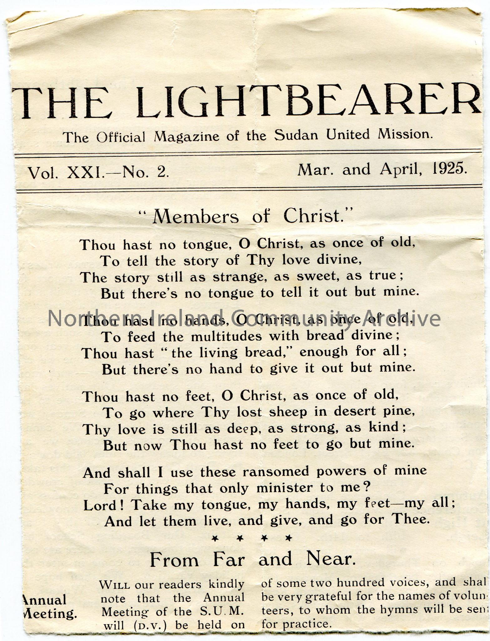 Cut out of a publication titled, 'The Lightbearer. The Official Magazine of the Sudan United Mission'. Vol. XXI - No. 2. Dated March and April, 1925. Words to hymn titled, 'Members of Christ'.