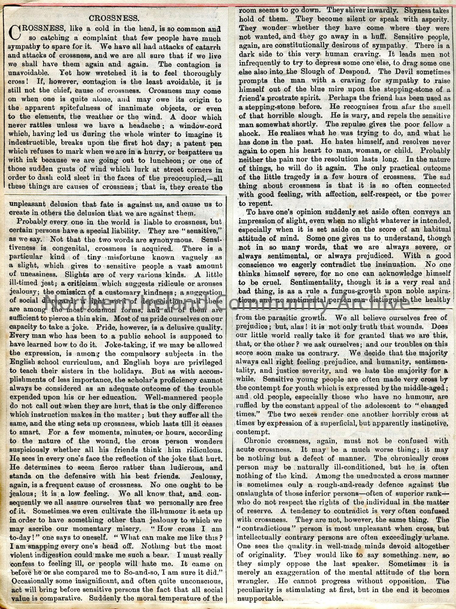 Cutting (3 sections) from a publication titled, ‘Crossness’. Discusses the emotion.