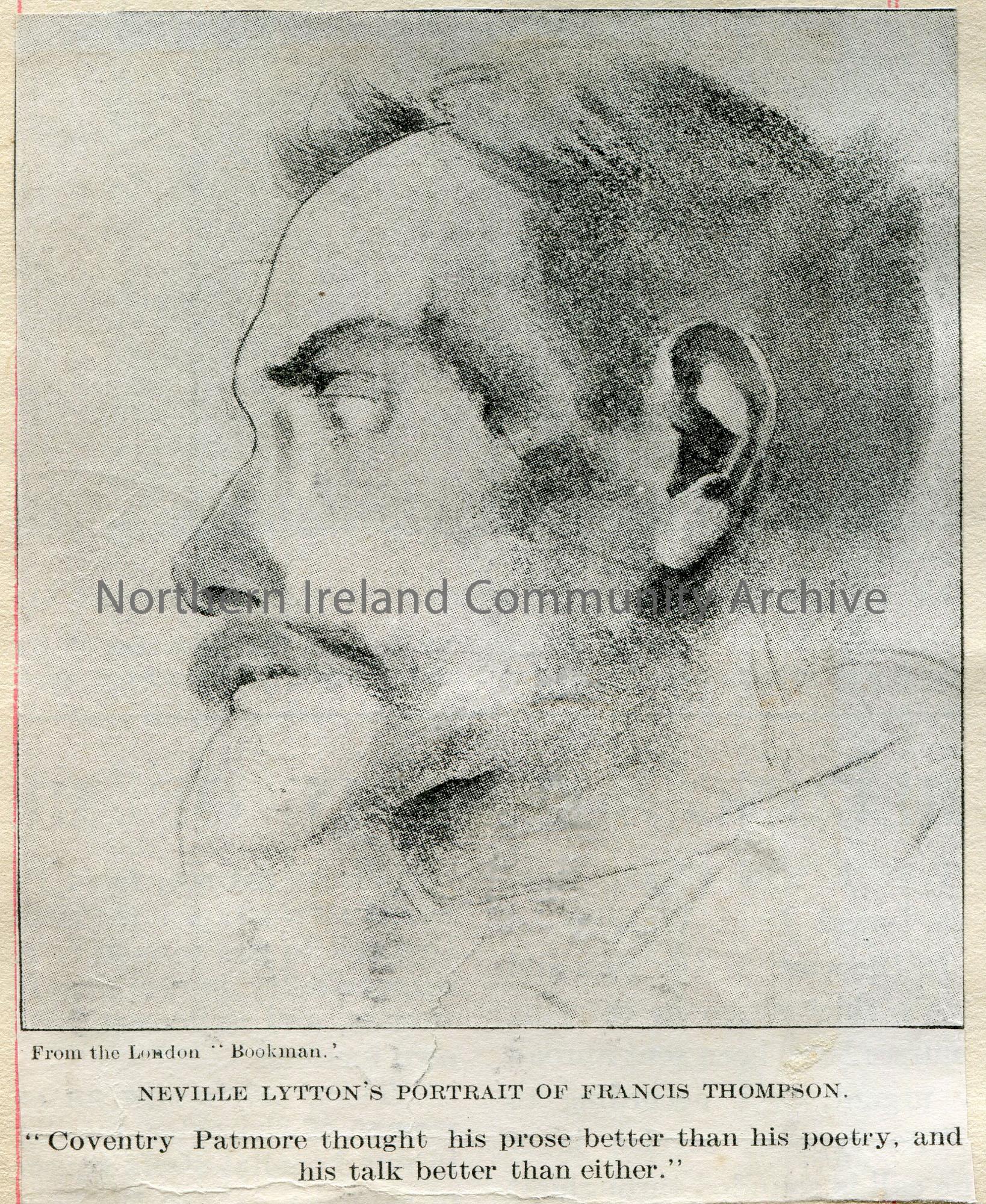 Cutting from a magazine of a black and white painting captioned, ‘Neville Lytton’s Portrait of Francis Thompson’.