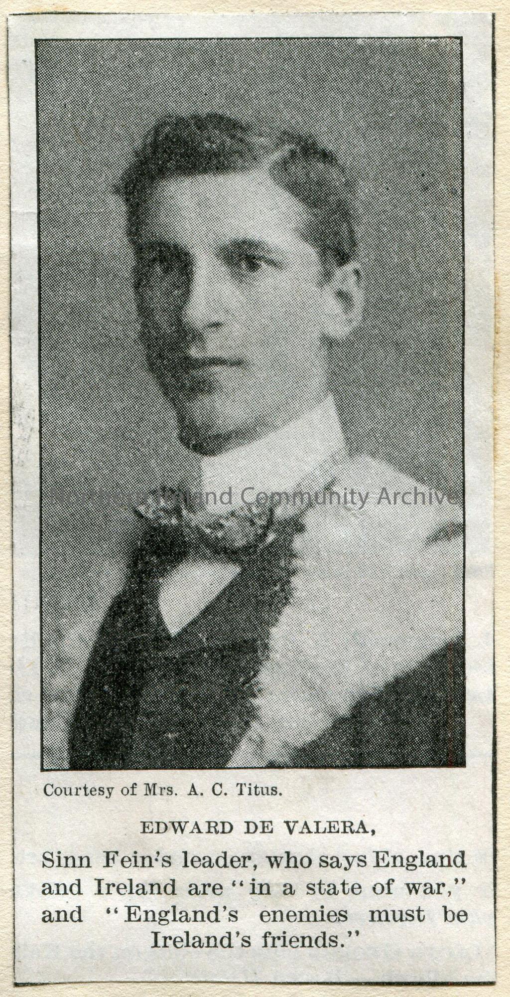 Cutting from a magazine of a black and white portrait photographic image of a Edward De Valera. Courtesy of Mrs A C Titus. Captioned, 'Sinn Fein's leader, who says England and Ireland are "in a state of war," and "England's enemies must be Ireland's friends."