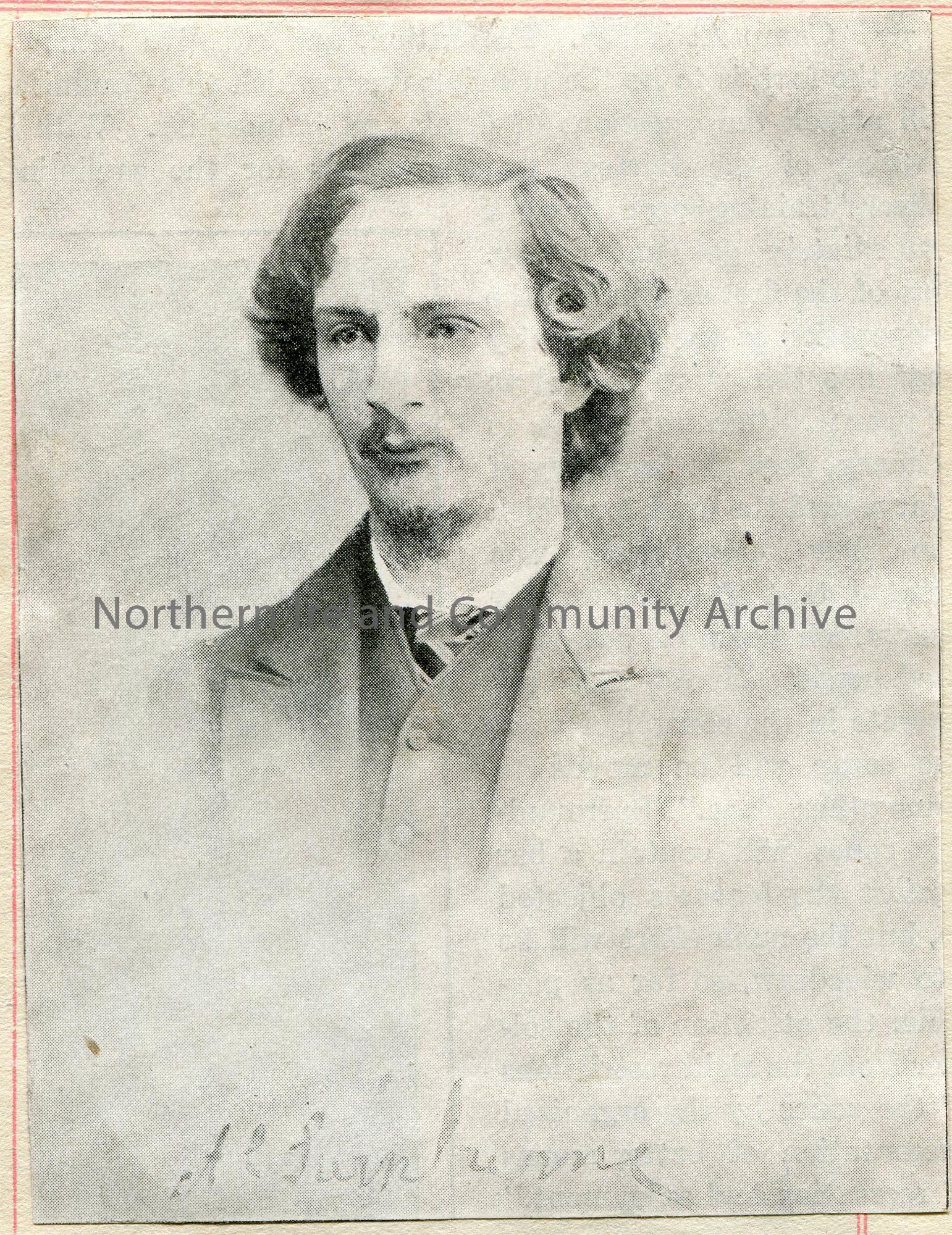 Cutting from a magazine of a black and white portrait photographic image of a man. He is wearing a stripe tie. A name is at the bottom of the image but is unclear. First initial is A.