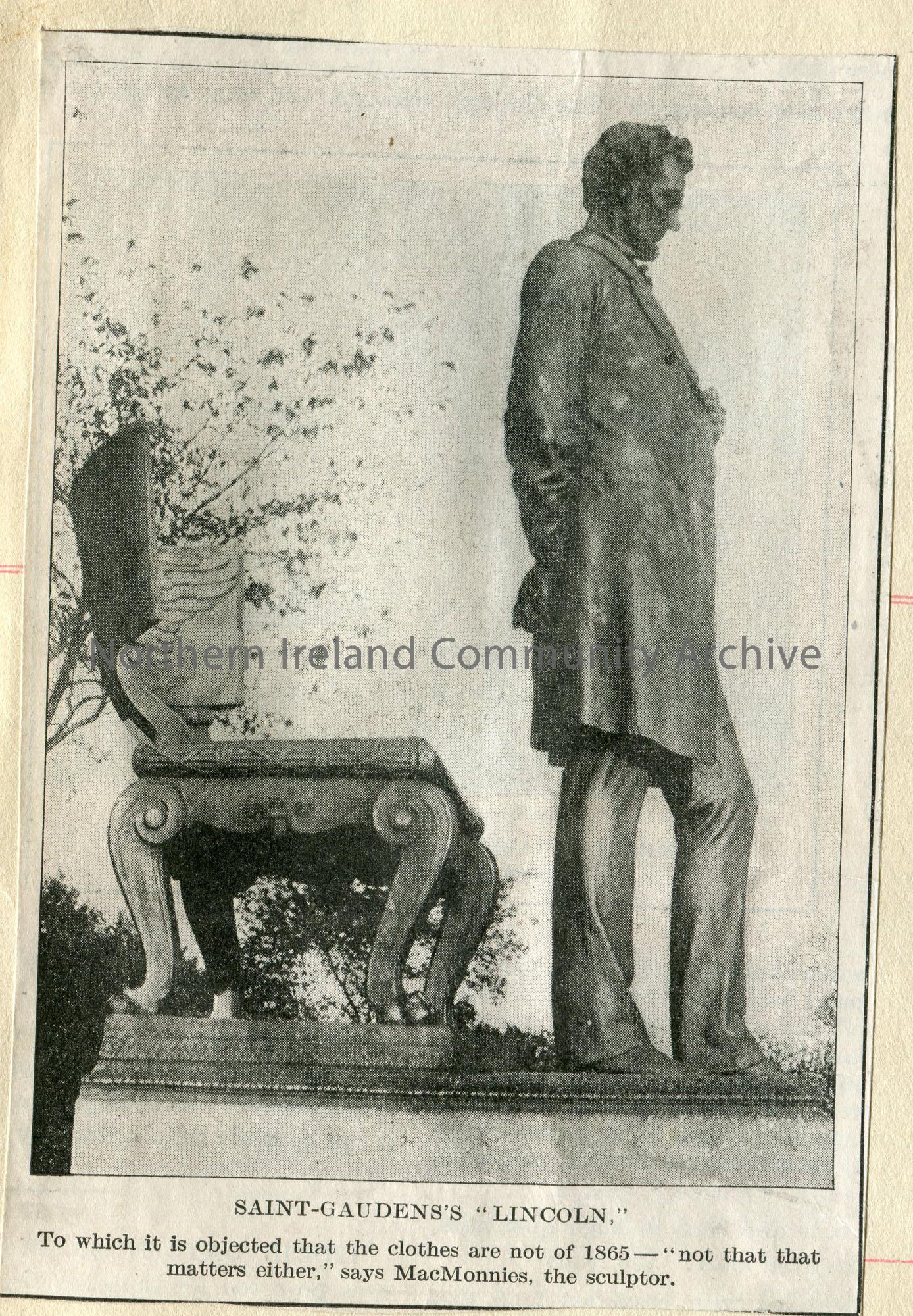 Cutting from a magazine or journal of a statue of Abraham Lincoln captioned, 'Saint-Gaudens's "Lincoln"' To which it is objected that the clothes are not of 1865, not that that matters either, says MacMonnies, the sculptor'.