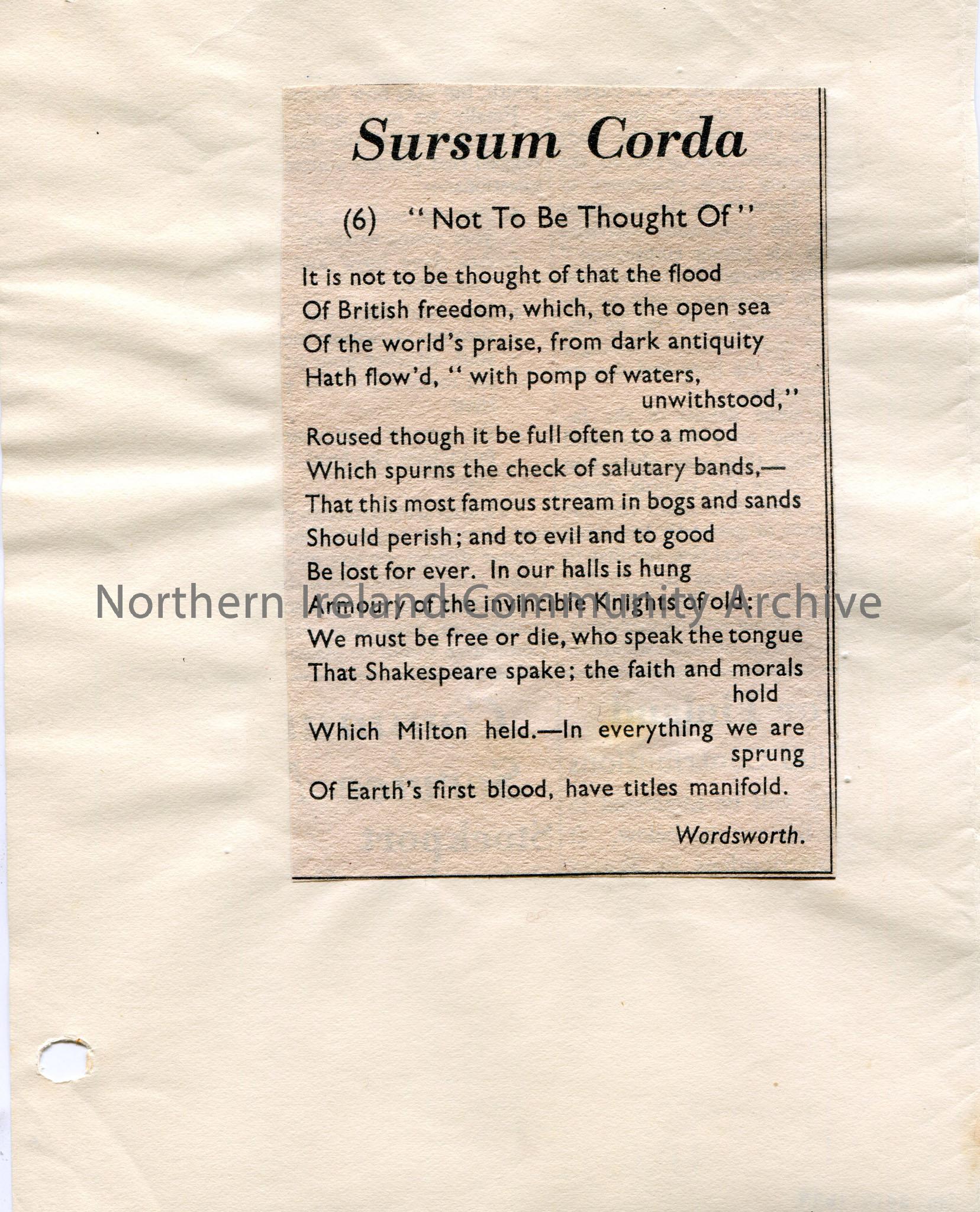 Cutting from a newspaper and stuck to paper of a poem titled, ‘Not To Be Thought Of’ by William Wordsworth. ‘Sursum Corda’ titled at top of cutting.