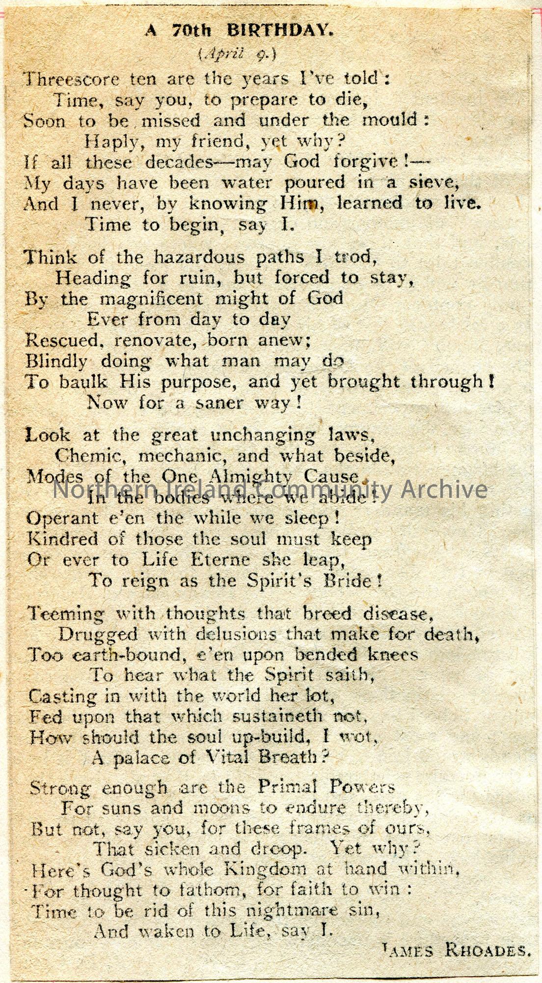 Cutting from a newspaper of a poem titled, ‘A 70th Birthday. (April 9.)’. By James Rhoades.