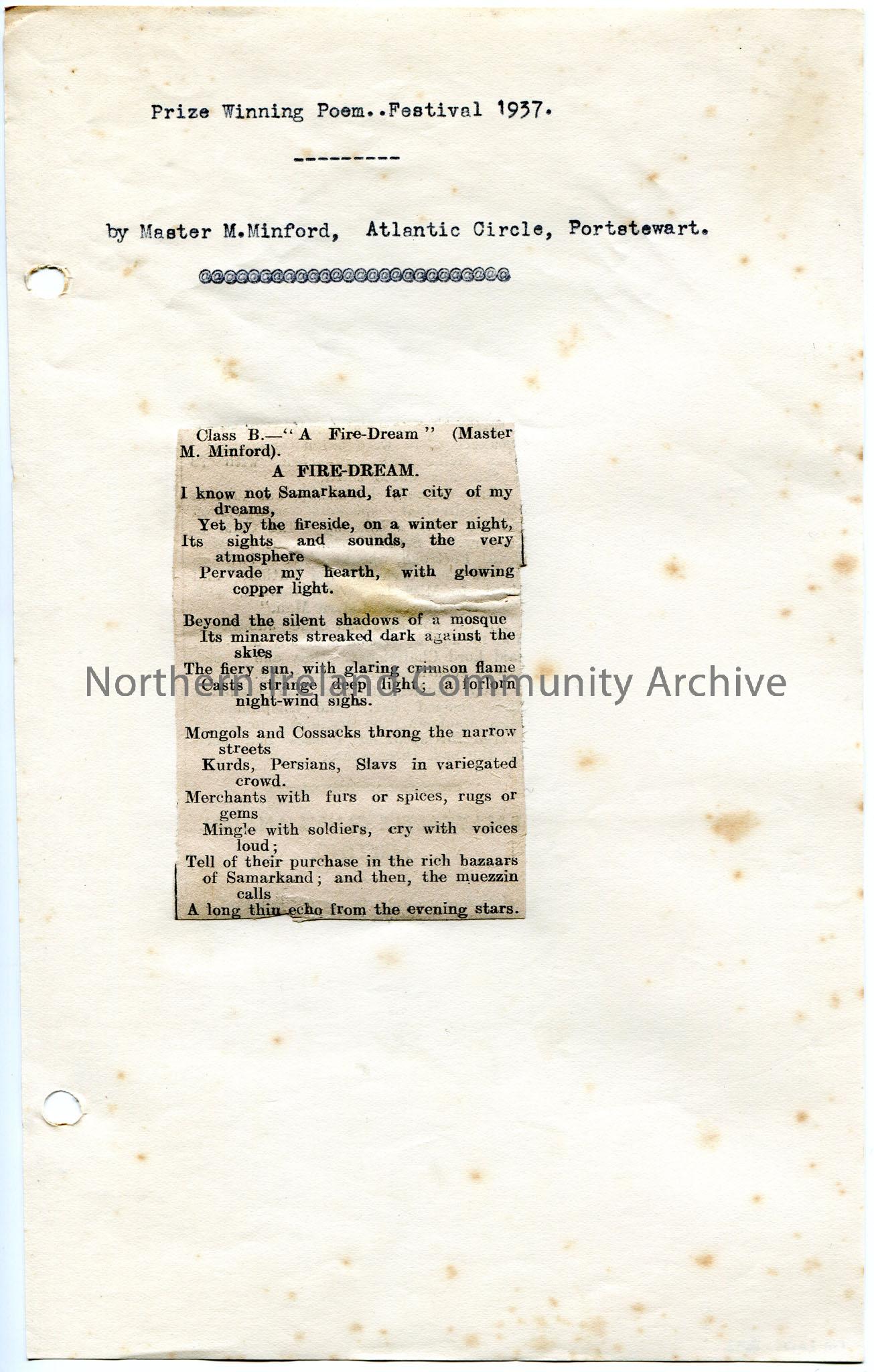 Cutting from a newspaper stuck to a larger page of a poem titled, 'Fire-Dream'. The poem was prize winning at a festival in 1937 by Master M. Minford, Atlantic Circle, Portstewart. Mentions Samarkand [Uzbekistan].