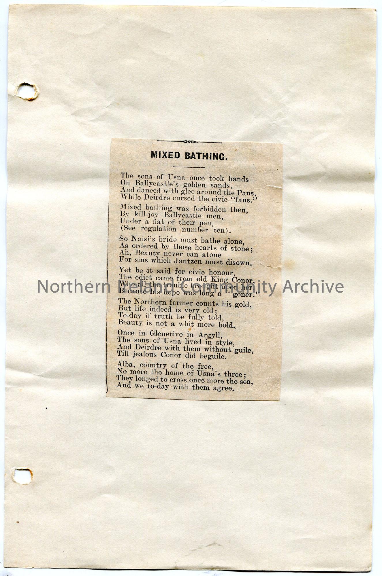 Cutting from a newspaper, stuck to paper, of a poem titled, 'Mixed Bathing'. Re Ballycastle, Deirdre and the sons of Usna.