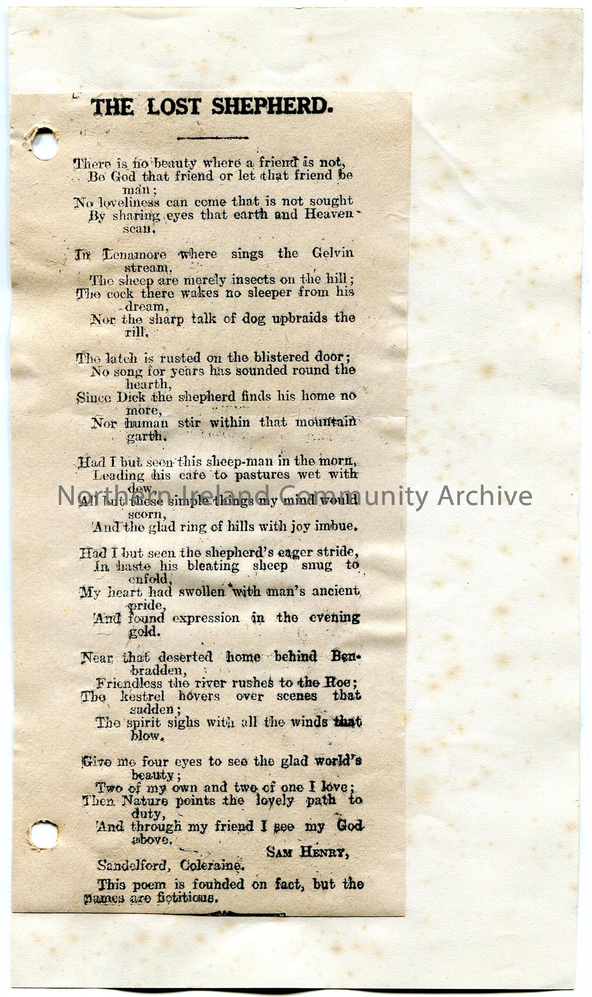 Cutting from a newspaper, stuck to paper, of a poem titled, 'The Lost Shepherd' by Sam Henry. Notes that the names within the poem are fictitious. Mentions Lenamore, Benbradden and the Roe.