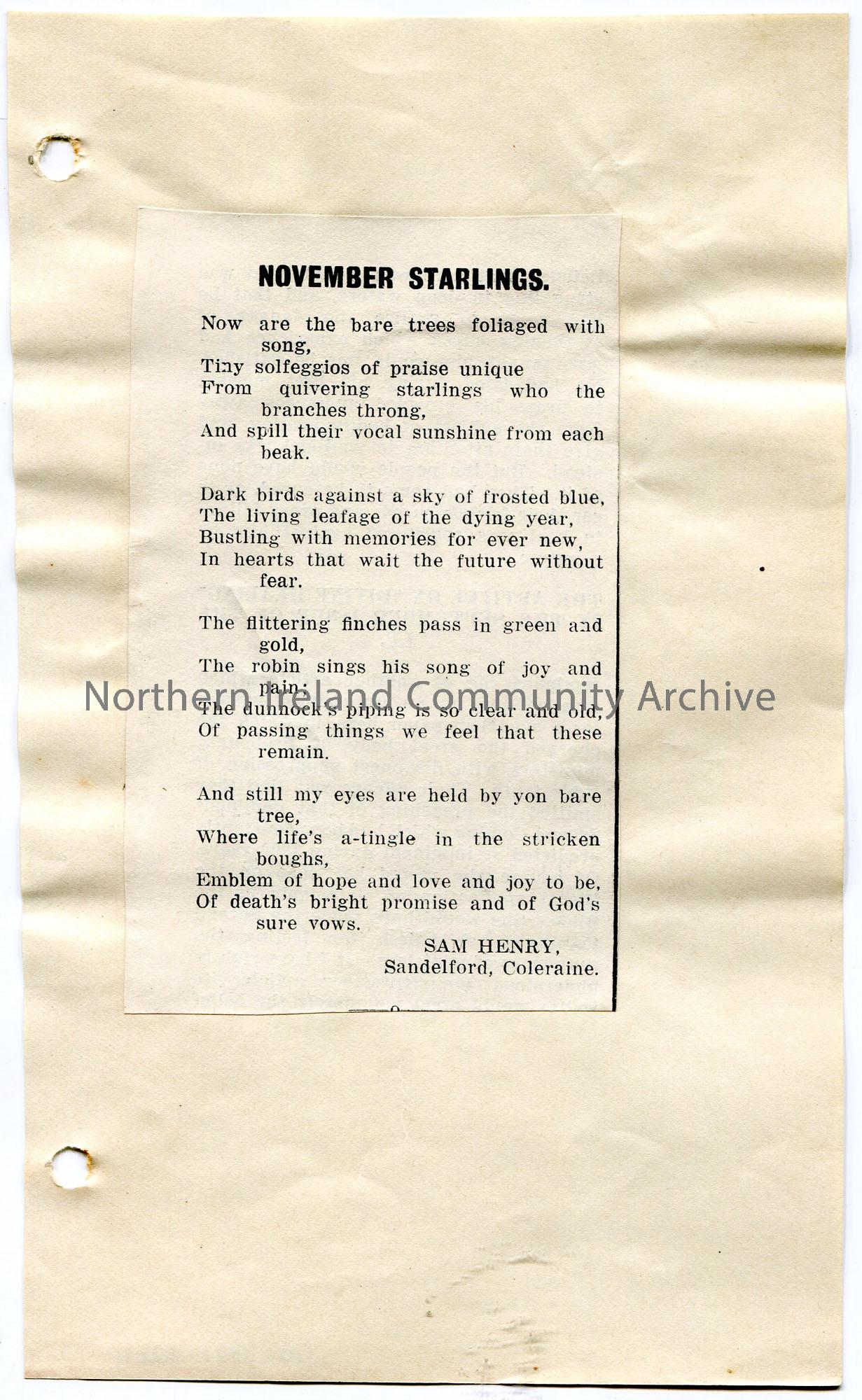 Cutting from a publication of a poem titled, 'November Starlings' stuck to paper. By Sam Henry.