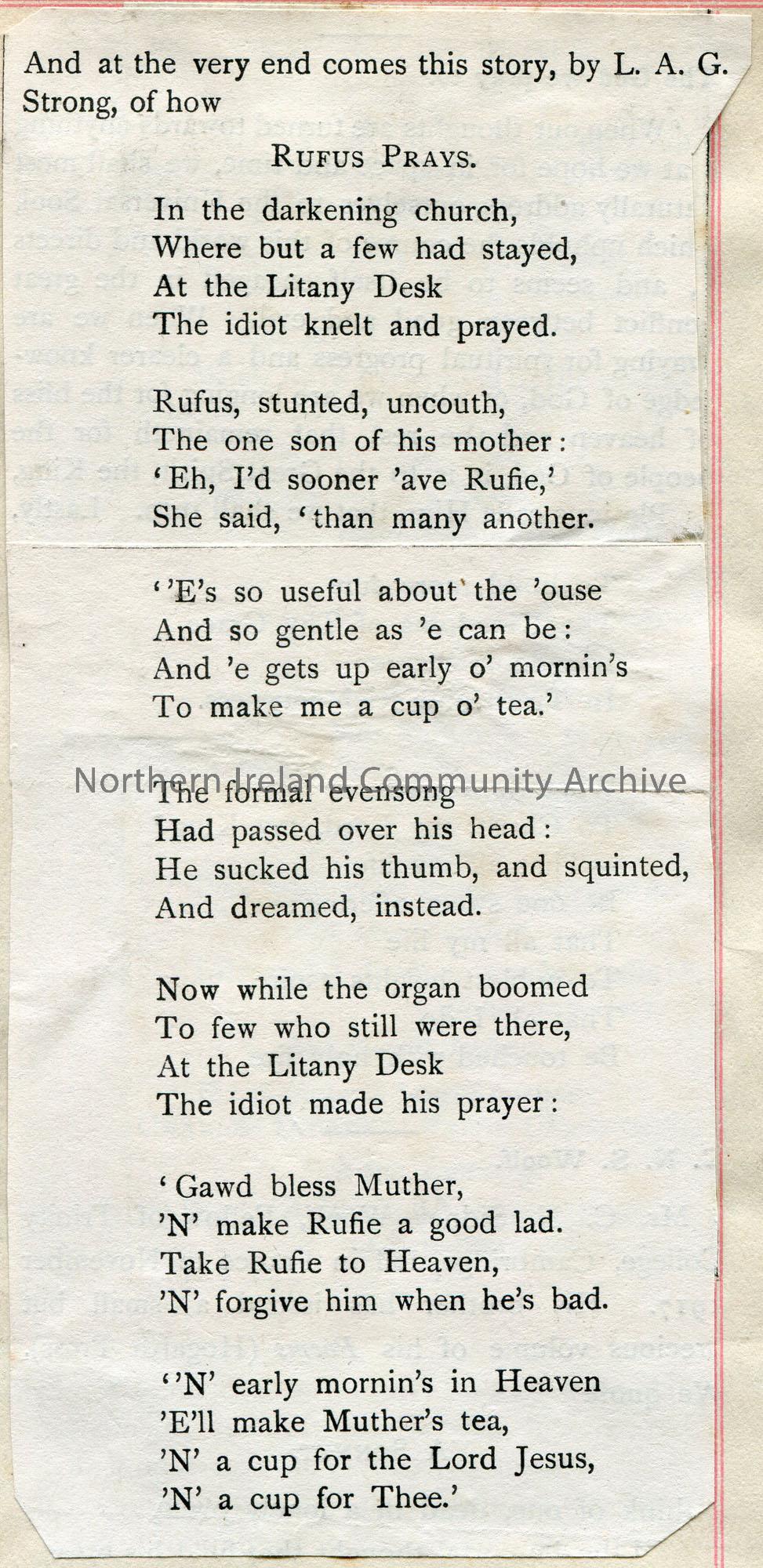 Cutting from a publication of a poem titled, ‘Rufus Prays’ by L.A.G. Strong.