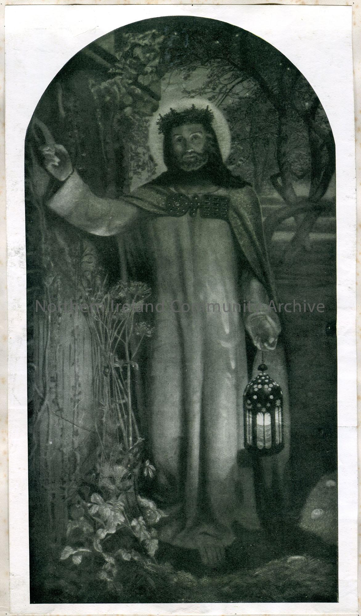 Cutting from a publication of a printed black and white image depicting Jesus Christ holding a lantern.