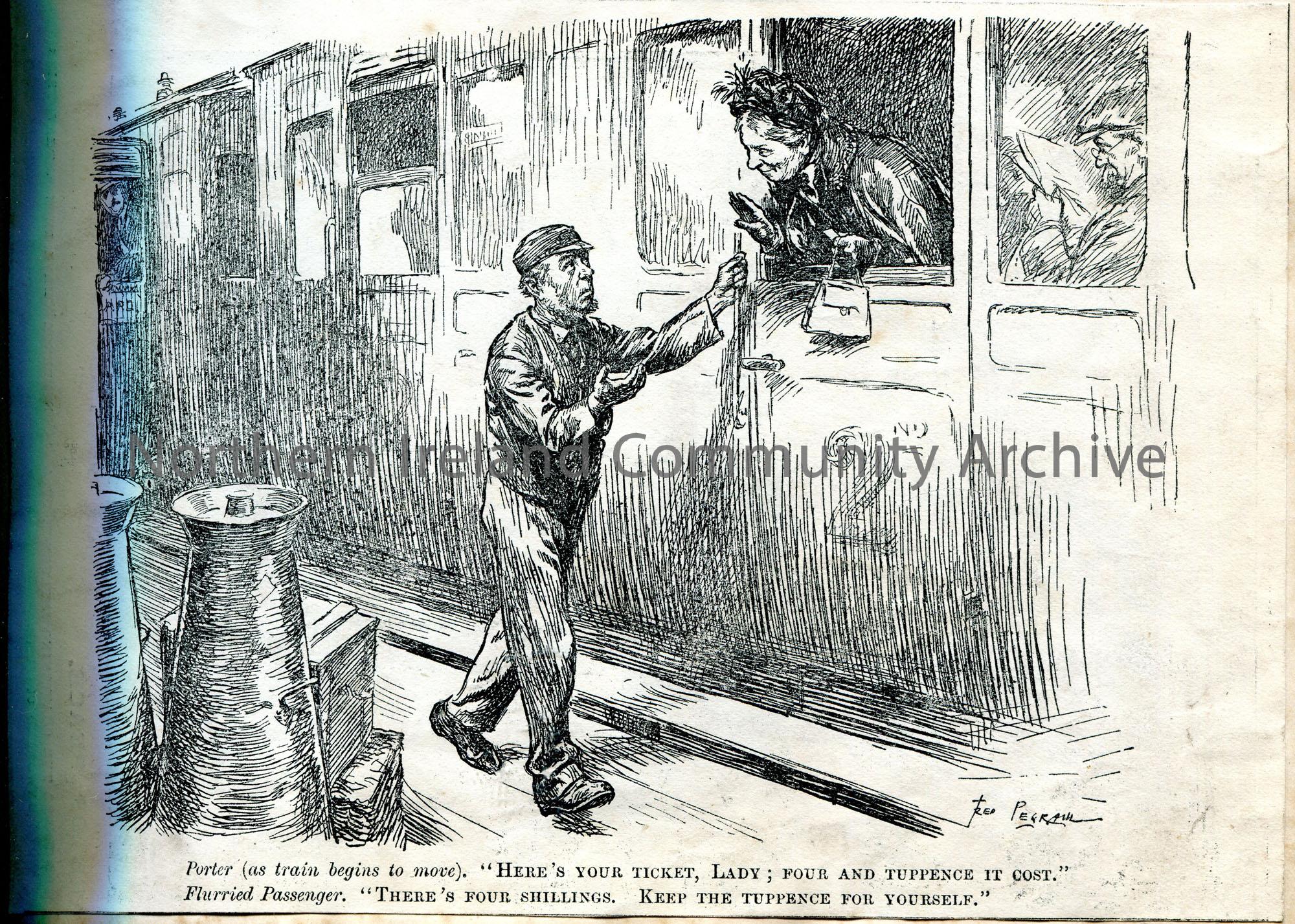 Cutting from a publication of a printed illustration. Humorous exchange between a train passenger and a porter. Image of a lady leaning out of a 2nd class train carriage. Signed Fred Pegram.