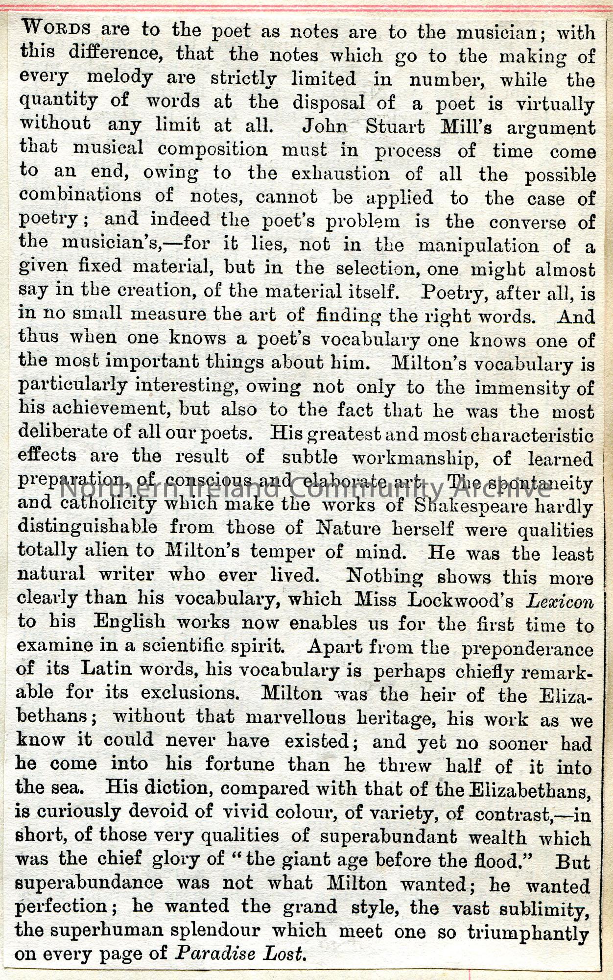 Cutting from a publication of a review of the poem ‘Paradise Lost’ by John Milton.