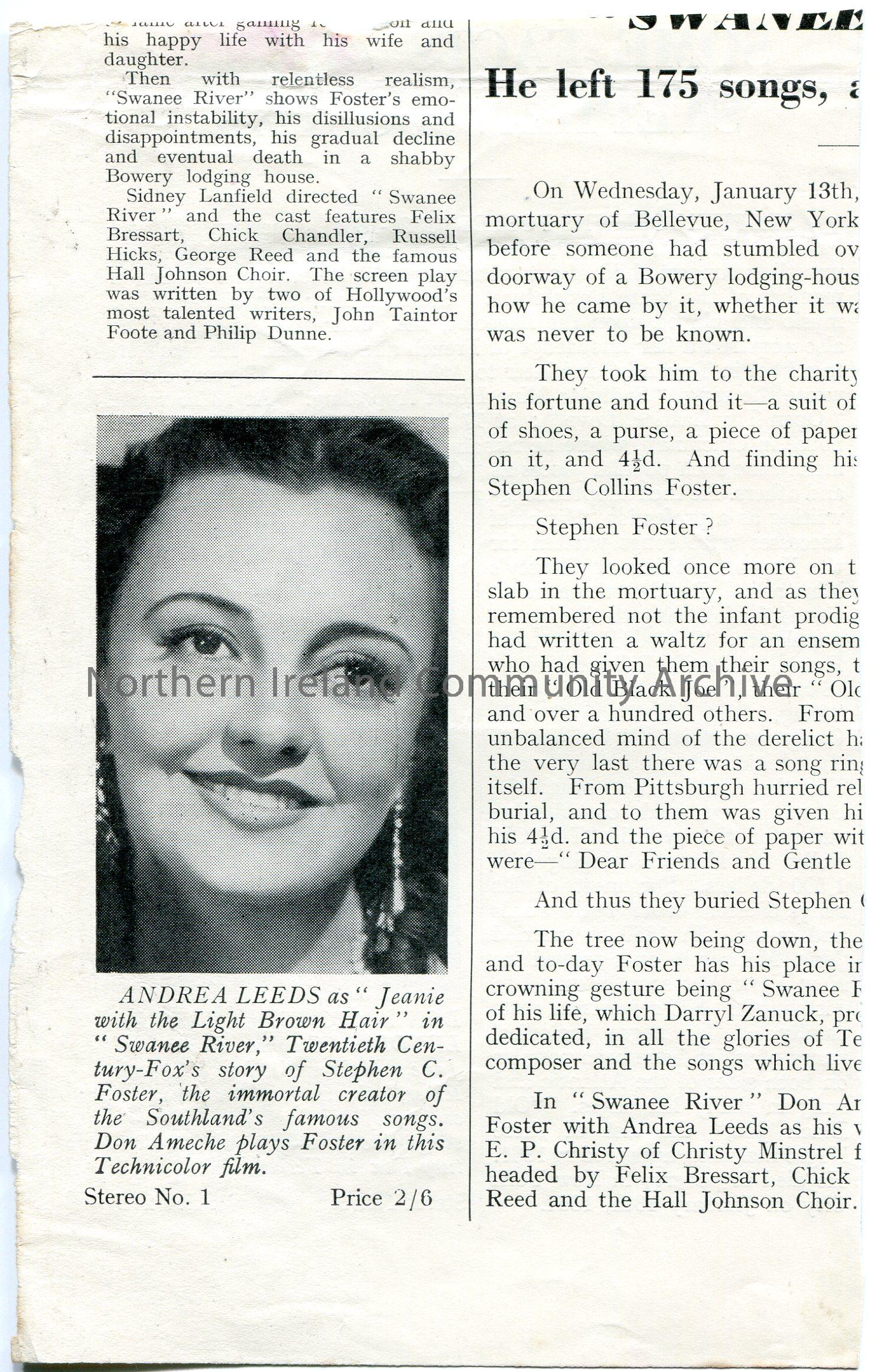 Cutting from a publication of an article titled, 'Some Facts About Stephen Foster'. Facts re the American song and ballad writer. Black and white photographic image of actor and actress playing Stephen Foster and his wife Jane McDowell in a film 'Swanee River'.