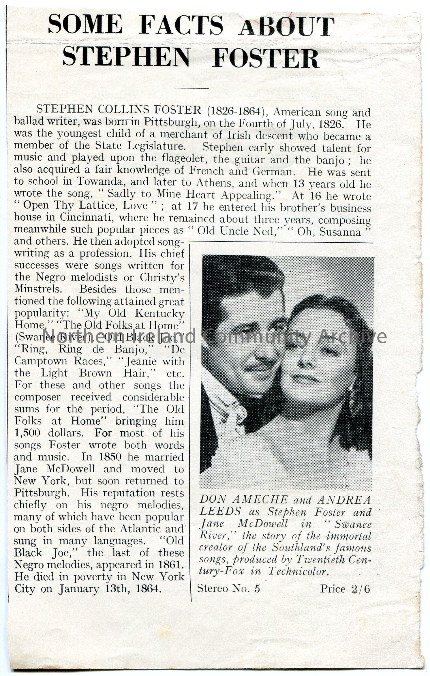 Cutting from a publication of an article titled, 'Some Facts About Stephen Foster'. Facts re the American song and ballad writer. Black and white photographic image of actor and actress playing Stephen Foster and his wife Jane McDowell in a film 'Swanee River'.