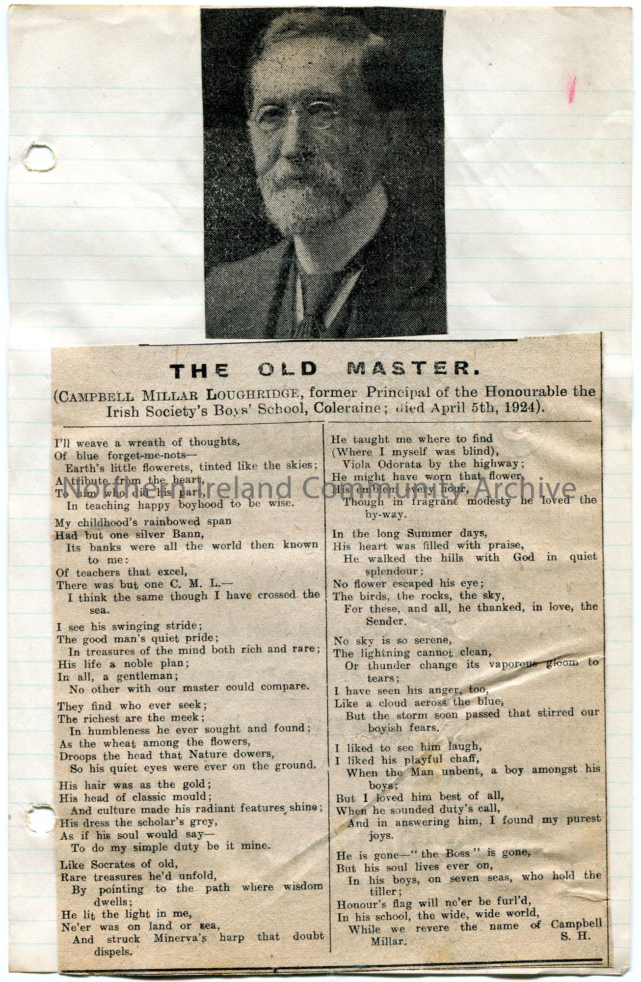 Cutting from newspaper, stuck to page, of a poem and photographic image of Campbell Millar Loughridge, former Principle of the Honourable the Irish Society's Boys' School, Coleraine. Titled, 'The Old Master'. S.H. initials in bottom corner.