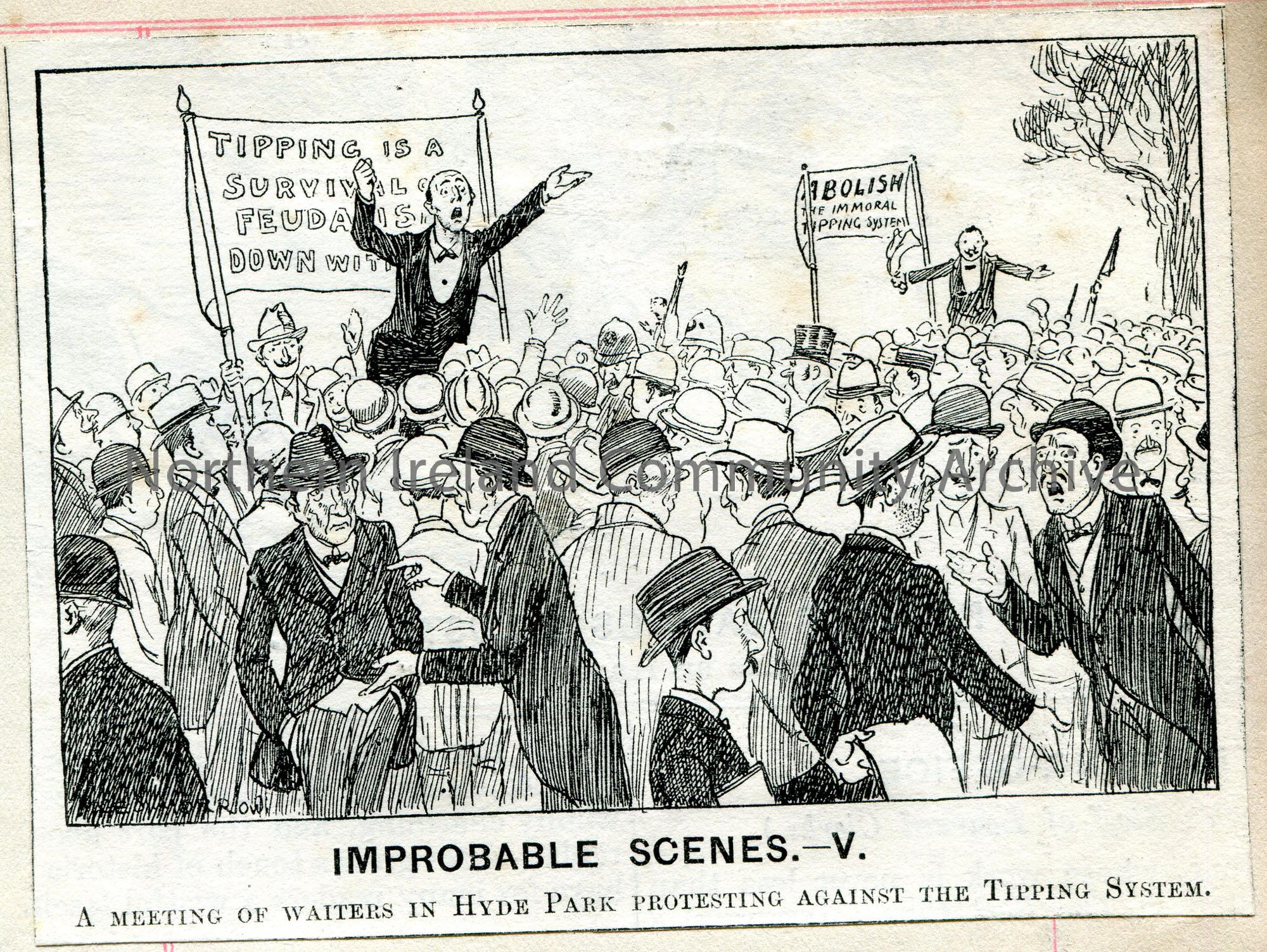 Cutting of a hand drawn cartoon from a publication captioned, 'Improbable Scenes.-V. A Meeting of Waiters in Hyde Park Protesting Against the Tipping System'.