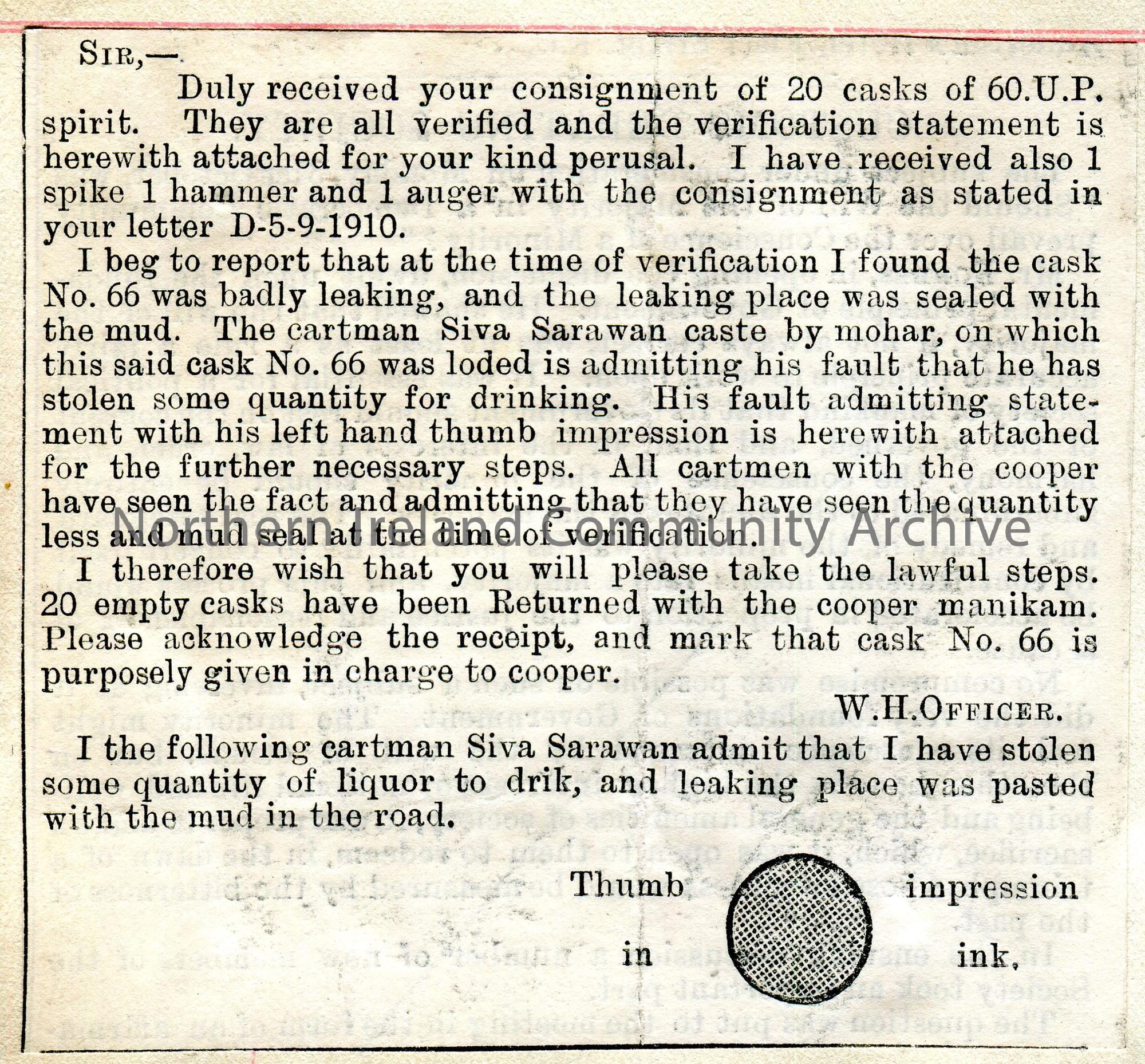 Cutting of a letter from a publication re stolen alcohol.