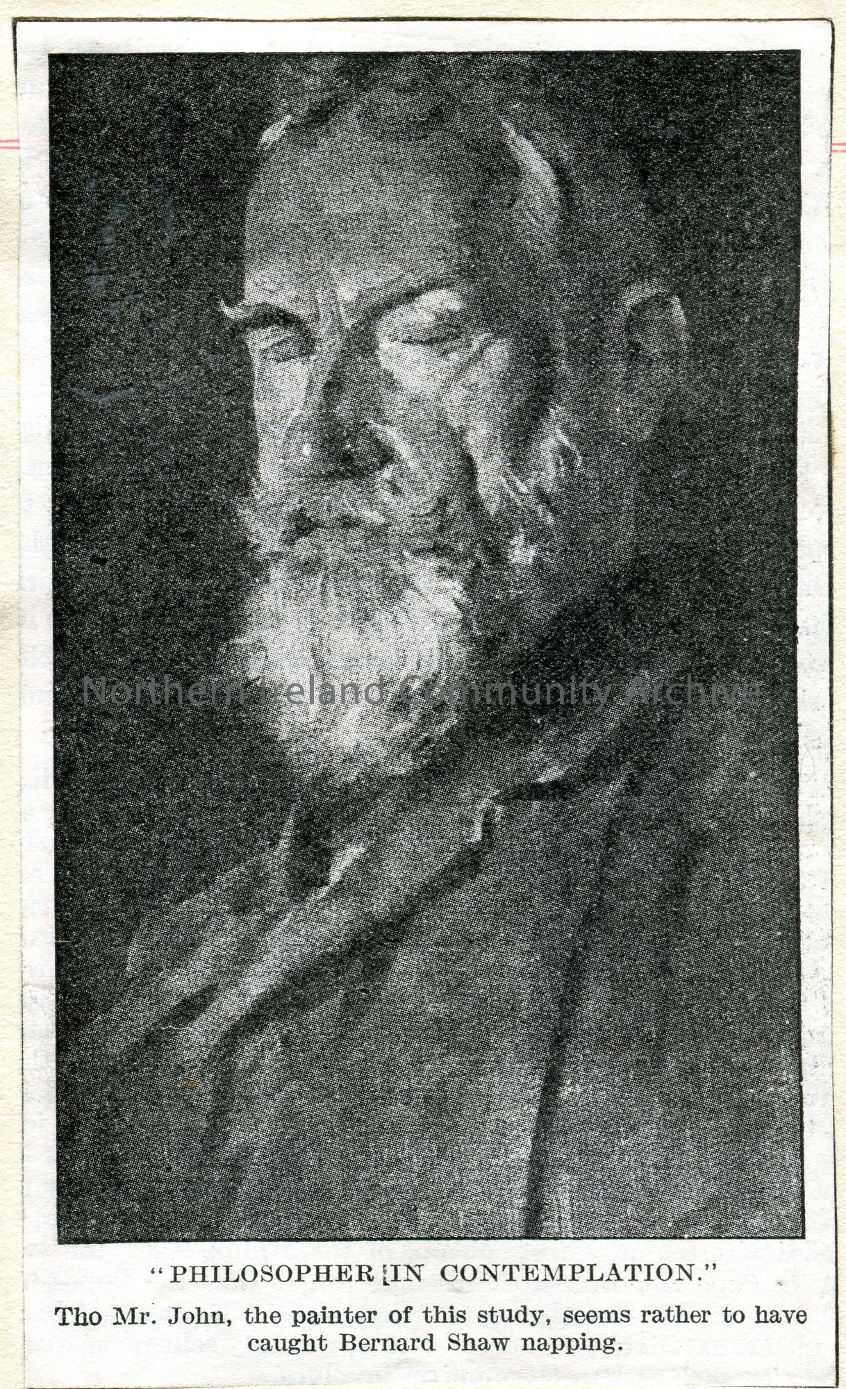 Cutting of a photographic image from a magazine or journal. Image of Bernard Shaw captioned, ‘Philosopher In Contemplation’.