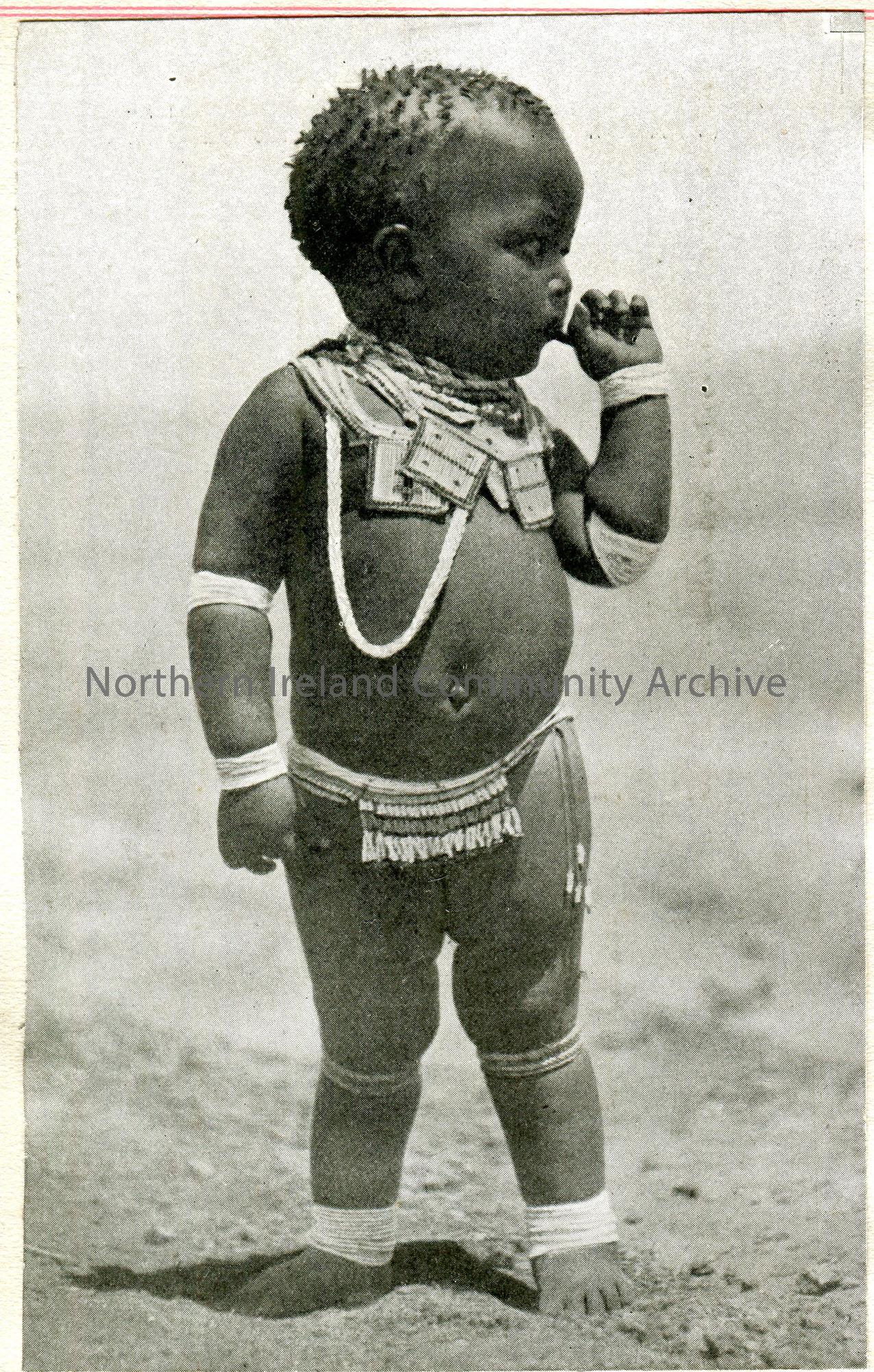 Cutting of a photographic image, possibly from a magazine or journal. Image is of an African child wearing traditional tribal clothing.