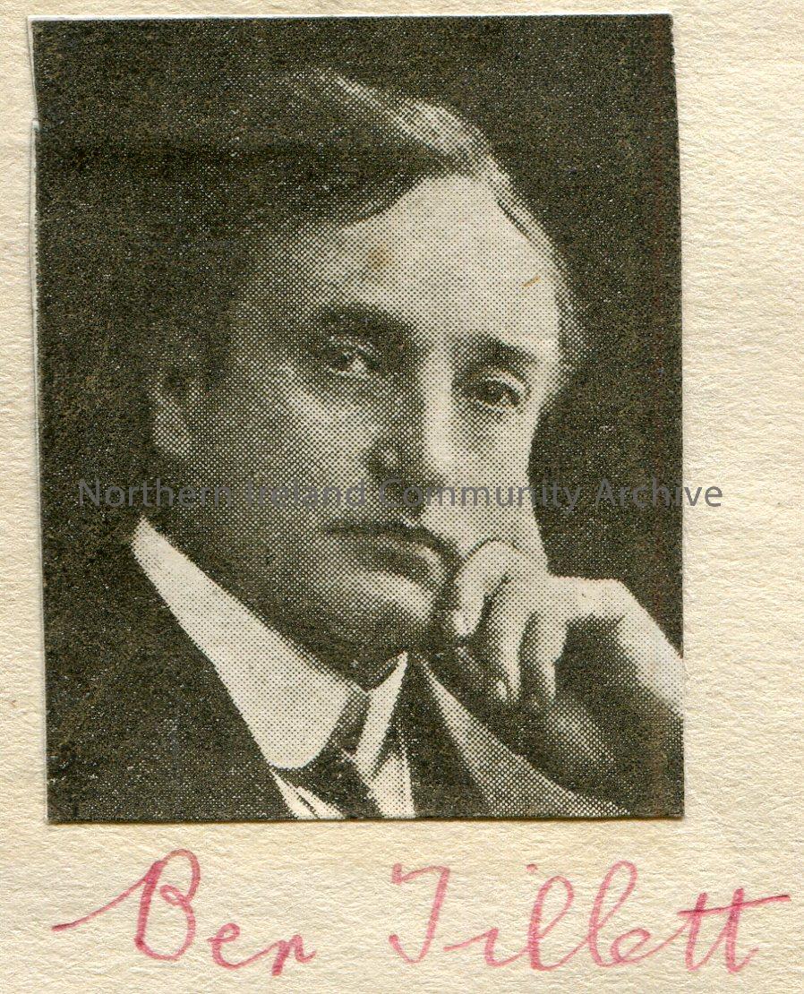 Cutting of a photographic portrait image of a man with his head in his hand captioned, ‘Ben Tillet’.