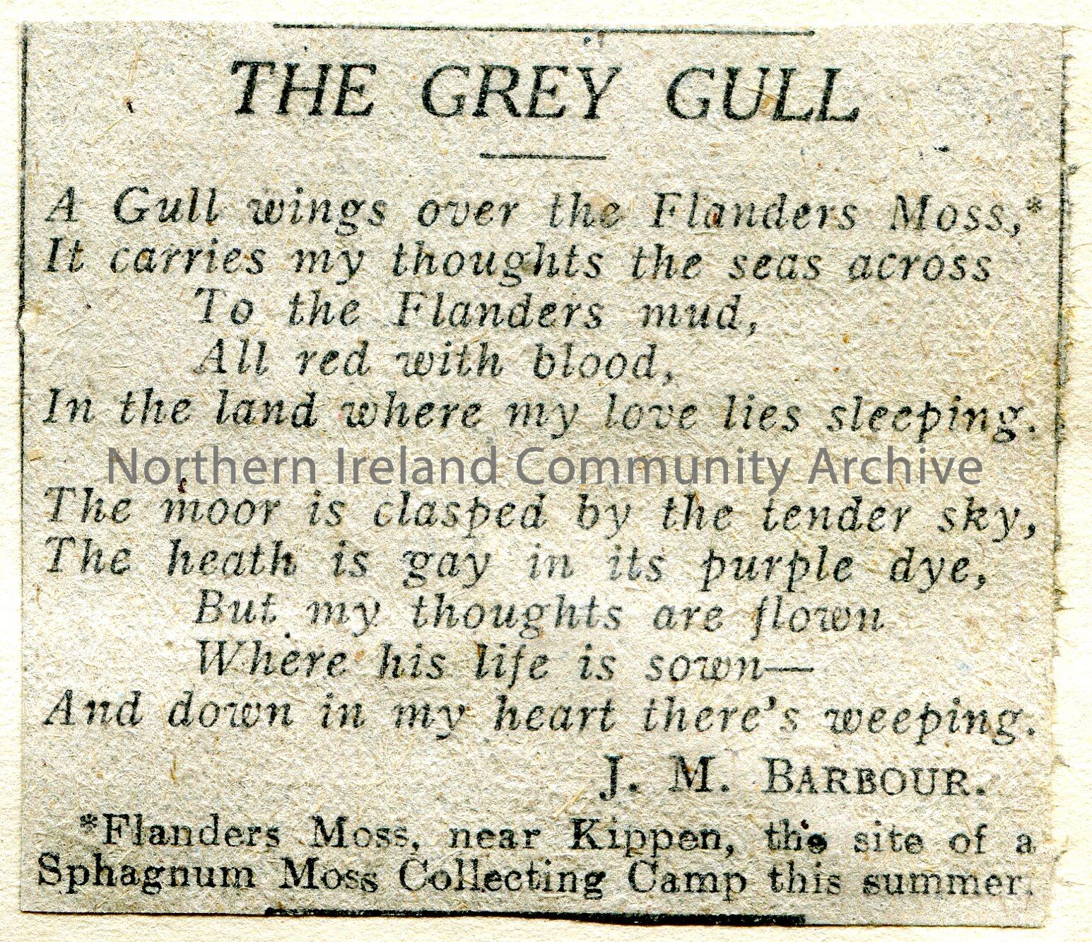 Cutting of a poem by J M Barbour titled, ‘The Grey Gull’. Mentions Flanders.