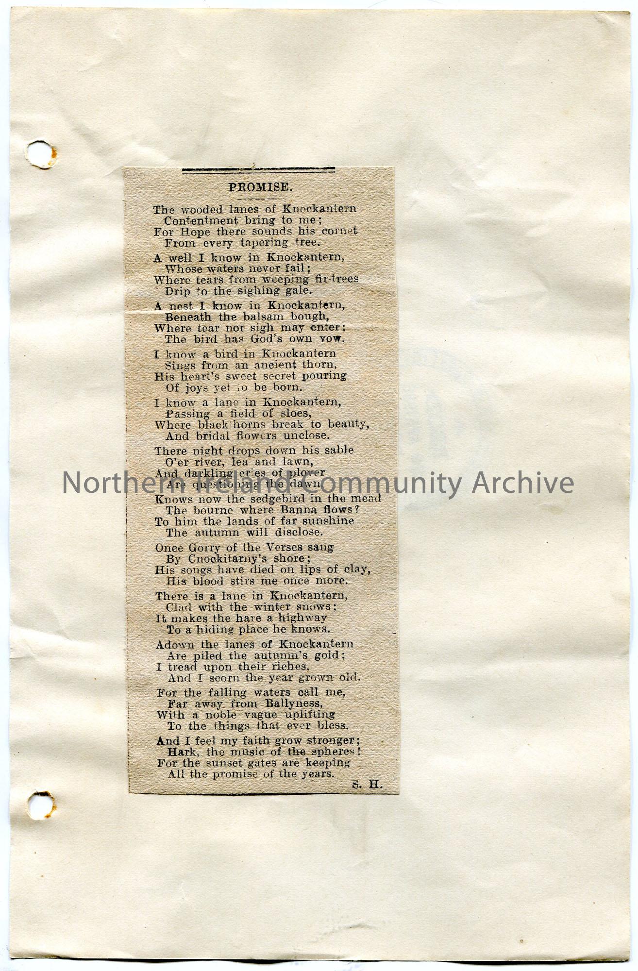 Cutting of a poem by Sam Henry titled, ‘Promise’. Re Knockantern. Received stamp from the British Broadcasting Corporation (BBC), Belfast, on back of …