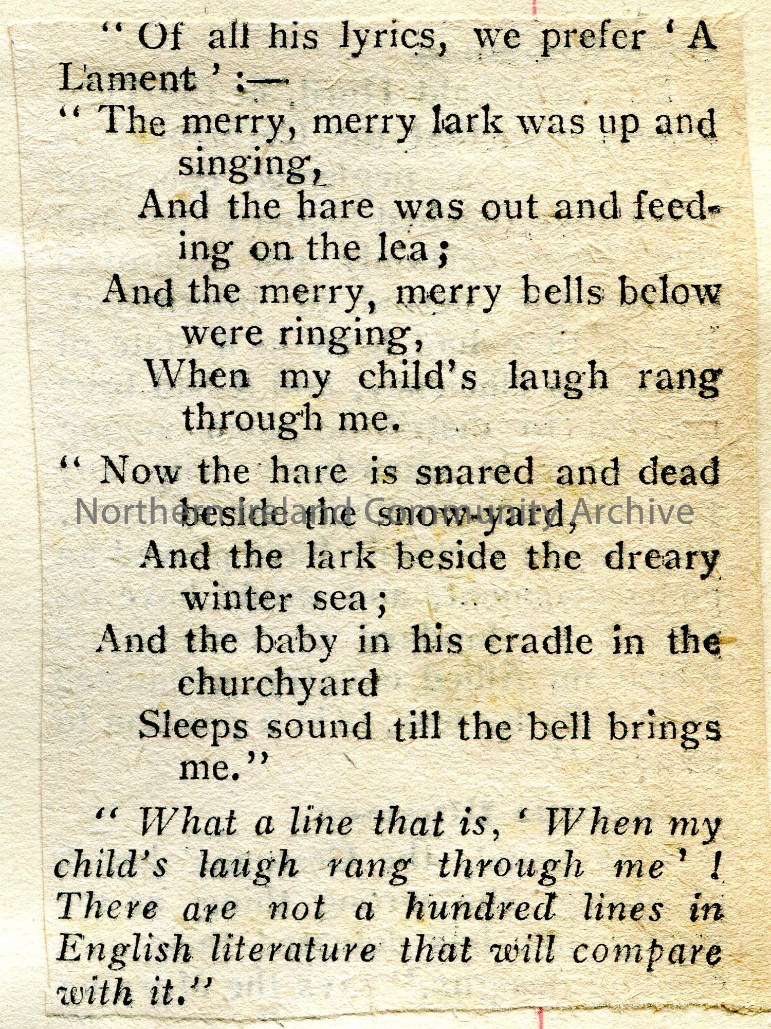 Cutting of a poem from a newspaper re a poem by Charles Kingsley. The first line is – “The merry, merry lark was up and singing”.