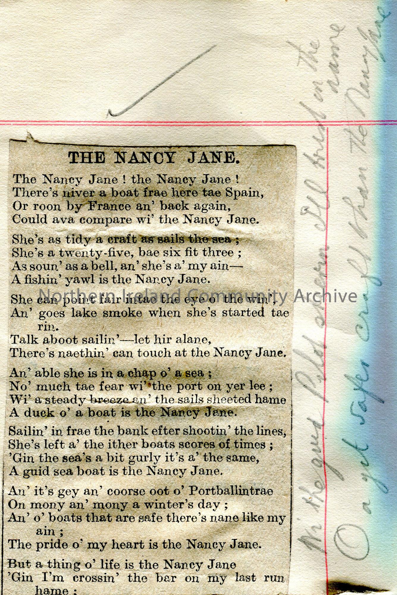 Cutting of a poem from a newspaper. Titled, 'The Nancy Jane'. Re the boat 'The Nancy Jane'. Mentions Portballintrae. Last lines are handwritten in pencil vertically beside cutting.