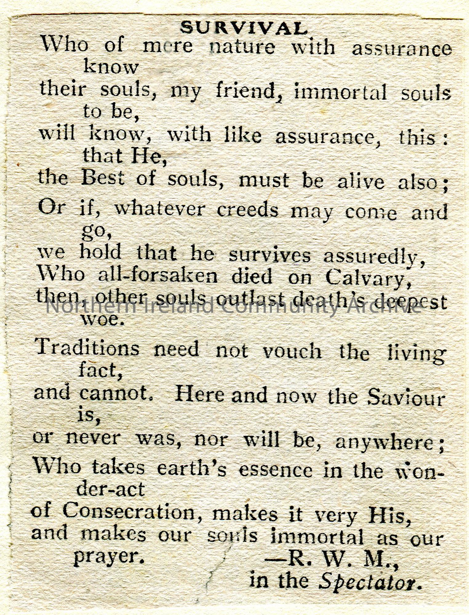 Cutting of a poem from a newspaper which was originally published in the ‘Spectator’ by R.W.M. Titled, ‘Survival’.